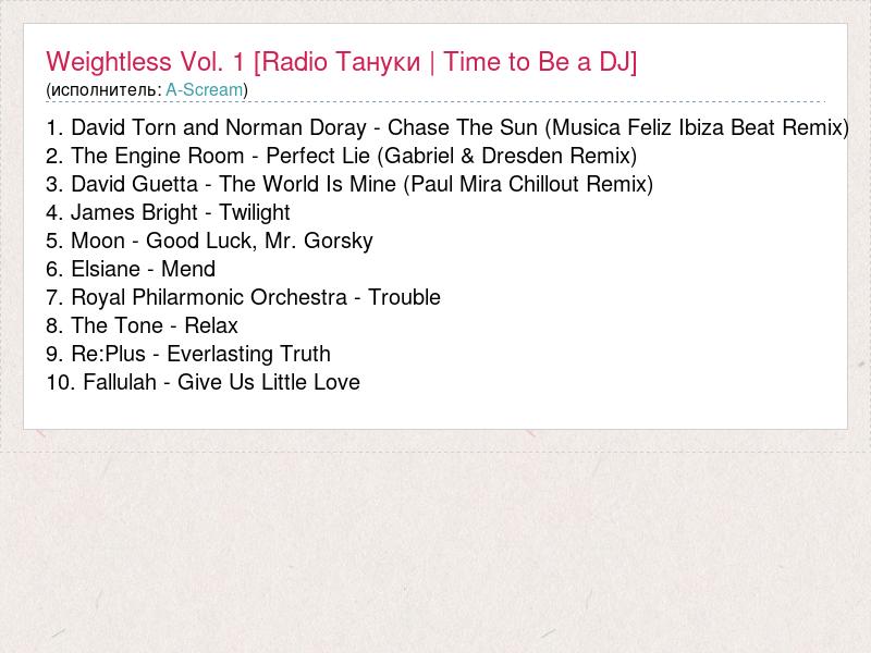 1. David Torn and Norman Doray - Chase The Sun (Musica Feliz Ibiza Beat Remix) 2. The Engine Room - Perfect Lie (Gabriel & Dresden Remix) 3. David Guetta - The World Is Mine (Paul Mira Chillout Remix) 4. James Bright - Twilight 5. Moon - Good Luck, Mr. Gorsky 6. Elsiane - Mend 7. Royal Philarmonic Orchestra - Trouble 8. The Tone - Relax 9. Re:Plus - Everlasting Truth 10. Fallulah - Give Us Little Love