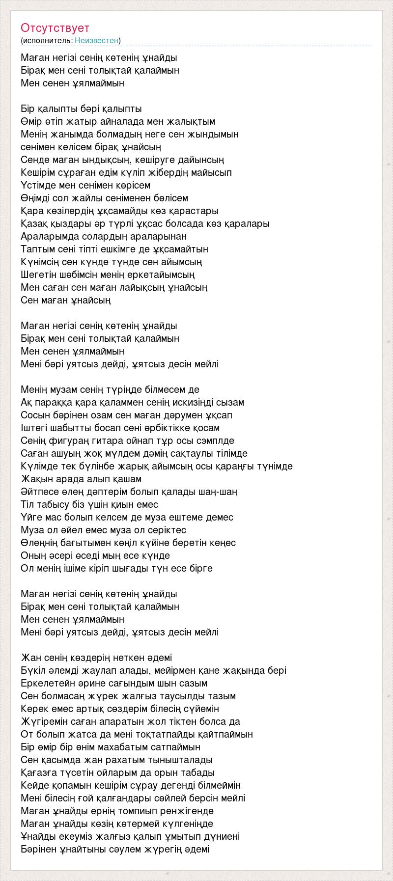 Маған негізі сенің көтенің ұнайды Бірақ мен сені толықтай қалаймын Мен сенен ұялмаймын Бір қалыпты бәрі қалыпты Өмір өтіп жатыр айналада мен жалықтым Менің жанымда болмадың неге сен жындымын сенімен келісем бірақ ұнайсың Сенде маған ындықсың, кешіруге дайынсың Кешірім сұраған едім күліп жібердің майысып Үстімде мен сенімен көрісем Өңімді сол жайлы сеніменен бөлісем Қара көзілердің ұқсамайды көз қарастары Қазақ қыздары әр түрлі ұқсас болсада көз қаралары Араларымда солардың араларынан Таптым сені тіпті ешкімге де ұқсамайтын Күнімсің сен күнде түнде сен айымсың Шегетін шөбімсін менің еркетайымсың Мен саған сен маған лайықсың ұнайсың Сен маған ұнайсың Маған негізі сенің көтенің ұнайды Бірақ мен сені толықтай қалаймын Мен сенен ұялмаймын Мені бәрі уятсыз дейді, ұятсыз десін мейлі Менің музам сенің түріңде білмесем де Ақ параққа қара қаламмен сенің искизіңді сызам Сосын бәрінен озам сен маған дәрумен ұқсап Іштегі шабытты босап сені әрбіктікке қосам Сенің фигураң гитара ойнап тұр осы сэмплде Саған ашуың жоқ мүлдем дәмің сақтаулы тілімде Күлімде тек бүлінбе жарық айымсың осы қараңғы түнімде Жақын арада алып қашам Әйтпесе өлең дәптерім болып қалады шаң-шаң Тіл табысу біз үшін қиын емес Үйге мас болып келсем де муза ештеме демес Муза ол әйел емес муза ол серіктес Өлеңнің бағытымен көңіл күйіне беретін кеңес Оның әсері өседі мың есе күнде Ол менің ішіме кіріп шығады түн есе бірге Маған негізі сенің көтенің ұнайды Бірақ мен сені толықтай қалаймын Мен сенен ұялмаймын Мені бәрі уятсыз дейді, ұятсыз десін мейлі Жан сенің көздерің неткен әдемі Бүкіл әлемді жаулап алады, мейірмен қане жақында бері Еркелетейн әрине сағындым шын сазым Сен болмасаң жүрек жалғыз таусылды тазым Керек емес артық сөздерім білесің сүйемін Жүгіремін саған апаратын жол тіктен болса да От болып жатса да мені тоқтатпайды қайтпаймын Бір өмір бір өнім махабатым сатпаймын Сен қасымда жан рахатым тынышталады Қағазға түсетін ойларым да орын табады Кейде қопамын кешірім сұрау дегенді білмеймін Мені білесің ғой қалғандары сөйлей берсін мейлі Маған ұнайды ернің томпиып ренжігенде Маған ұнайды көзің көтермей күлгеніңде Ұнайды екеуміз жалғыз қалып ұмытып дүниені Бәрінен ұнайтыны сәулем жүрегің әдемі