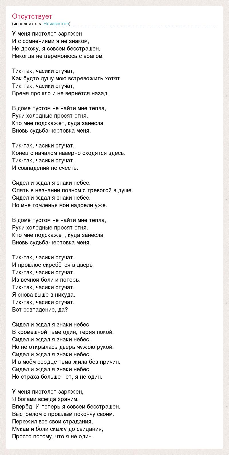 У меня пистолет заряжен И с сомнениями я не знаком, Не дрожу, я совсем бесстрашен, Никогда не церемонюсь с врагом. Тик-так, часики стучат, Как будто душу мою встревожить хотят. Тик-так, часики стучат, Время прошло и не вернётся назад. В доме пустом не найти мне тепла, Руки холодные просят огня. Кто мне подскажет, куда занесла Вновь судьба-чертовка меня. Тик-так, часики стучат. Конец с началом наверно сходятся здесь. Тик-так, часики стучат, И совпадений не счесть. Сидел и ждал я знаки небес. Опять в незнании полном с тревогой в душе. Сидел и ждал я знаки небес. Но мне томленья мои надоели уже. В доме пустом не найти мне тепла, Руки холодные просят огня. Кто мне подскажет, куда занесла Вновь судьба-чертовка меня. Тик-так, часики стучат. И прошлое скребётся в дверь Тик-так, часики стучат. Из вечной боли и потерь. Тик-так, часики стучат. Я снова выше в никуда. Тик-так, часики стучат. Вот совпадение, да? Сидел и ждал я знаки небес В кромешной тьме один, теряя покой. Сидел и ждал я знаки небес, Но не открылась дверь чужою рукой. Сидел и ждал я знаки небес, И в моём сердце тьма жила без причин. Сидел и ждал я знаки небес, Но страха больше нет, я не один. У меня пистолет заряжен, Я богами всегда храним. Вперёд! И теперь я совсем бесстрашен. Выстрелом с прошлым покончу своим. Пережил все свои страдания, Мукам и боли скажу до свидания, Просто потому, что я не один.