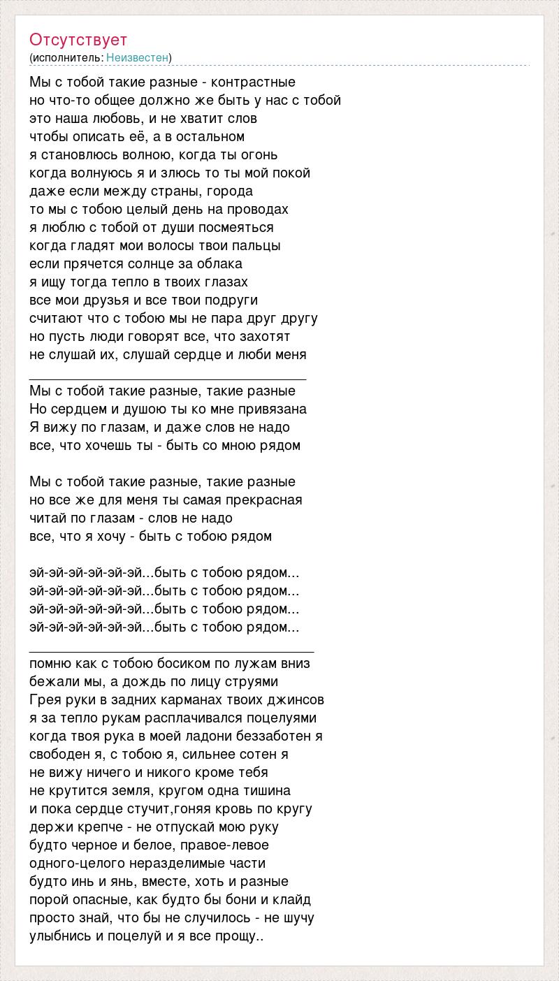 Мы с тобой такие разные - контрастные но что-то общее должно же быть у нас с тобой это наша любовь, и не хватит слов чтобы описать её, а в остальном я становлюсь волною, когда ты огонь когда волнуюсь я и злюсь то ты мой покой даже если между страны, города то мы с тобою целый день на проводах я люблю с тобой от души посмеяться когда гладят мои волосы твои пальцы если прячется солнце за облака я ищу тогда тепло в твоих глазах все мои друзья и все твои подруги считают что с тобою мы не пара друг другу но пусть люди говорят все, что захотят не слушай их, слушай сердце и люби меня ____________________________________ Мы с тобой такие разные, такие разные Но сердцем и душою ты ко мне привязана Я вижу по глазам, и даже слов не надо все, что хочешь ты - быть со мною рядом Мы с тобой такие разные, такие разные но все же для меня ты самая прекрасная читай по глазам - слов не надо все, что я хочу - быть с тобою рядом эй-эй-эй-эй-эй-эй...быть с тобою рядом... эй-эй-эй-эй-эй-эй...быть с тобою рядом... эй-эй-эй-эй-эй-эй...быть с тобою рядом... эй-эй-эй-эй-эй-эй...быть с тобою рядом... _____________________________________ помню как с тобою босиком по лужам вниз бежали мы, а дождь по лицу струями Грея руки в задних карманах твоих джинсов я за тепло рукам расплачивался поцелуями когда твоя рука в моей ладони беззаботен я свободен я, с тобою я, сильнее сотен я не вижу ничего и никого кроме тебя не крутится земля, кругом одна тишина и пока сердце стучит,гоняя кровь по кругу держи крепче - не отпускай мою руку будто черное и белое, правое-левое одного-целого неразделимые части будто инь и янь, вместе, хоть и разные порой опасные, как будто бы бони и клайд просто знай, что бы не случилось - не шучу улыбнись и поцелуй и я все прощу..
