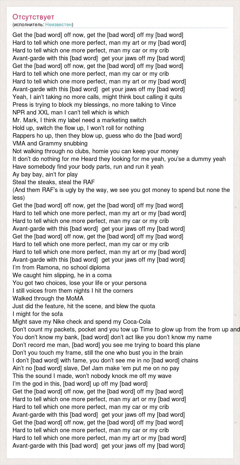 Get the [bad word] off now, get the [bad word] off my [bad word] Hard to tell which one more perfect, man my art or my [bad word] Hard to tell which one more perfect, man my car or my crib Avant-garde with this [bad word] get your jaws off my [bad word] Get the [bad word] off now, get the [bad word] off my [bad word] Hard to tell which one more perfect, man my car or my crib Hard to tell which one more perfect, man my art or my [bad word] Avant-garde with this [bad word] get your jaws off my [bad word] Yeah, I ain’t taking no more calls, might think bout calling it quits Press is trying to block my blessings, no more talking to Vince NPR and XXL man I can’t tell which is which Mr. Mark, I think my label need a marketing switch Hold up, switch the flow up, I won’t roll for nothing Rappers ho up, then they blow up, guess who do the [bad word] VMA and Grammy snubbing Not walking through no clubs, homie you can keep your money It don’t do nothing for me Heard they looking for me yeah, you’se a dummy yeah Have somebody find your body parts, run and run it yeah Ay bay bay, ain’t for play Steal the steaks, steal the RAF (And them RAF’s is ugly by the way, we see you got money to spend but none the less) Get the [bad word] off now, get the [bad word] off my [bad word] Hard to tell which one more perfect, man my art or my [bad word] Hard to tell which one more perfect, man my car or my crib Avant-garde with this [bad word] get your jaws off my [bad word] Get the [bad word] off now, get the [bad word] off my [bad word] Hard to tell which one more perfect, man my car or my crib Hard to tell which one more perfect, man my art or my [bad word] Avant-garde with this [bad word] get your jaws off my [bad word] I’m from Ramona, no school diploma We caught him slipping, he in a coma You got two choices, lose your life or your persona I still voices from them nights I hit the corners Walked through the MoMA Just did the feature, hit the scene, and blew the quota I might for the sofa Might save my Nike check and spend my Coca-Cola Don’t count my packets, pocket and you tow up Time to glow up from the from up and You don’t know my bank, [bad word] don’t act like you don’t know my name Don’t record me man, [bad word] you see me trying to board this plane Don’t you touch my frame, still the one who bust you in the brain I don’t [bad word] with fame, you don’t see me in no [bad word] chains Ain’t no [bad word] slave, Def Jam make 'em put me on no pay This the sound I made, won’t nobody knock me off my wave I’m the god in this, [bad word] up off my [bad word] Get the [bad word] off now, get the [bad word] off my [bad word] Hard to tell which one more perfect, man my art or my [bad word] Hard to tell which one more perfect, man my car or my crib Avant-garde with this [bad word] get your jaws off my [bad word] Get the [bad word] off now, get the [bad word] off my [bad word] Hard to tell which one more perfect, man my car or my crib Hard to tell which one more perfect, man my art or my [bad word] Avant-garde with this [bad word] get your jaws off my [bad word]