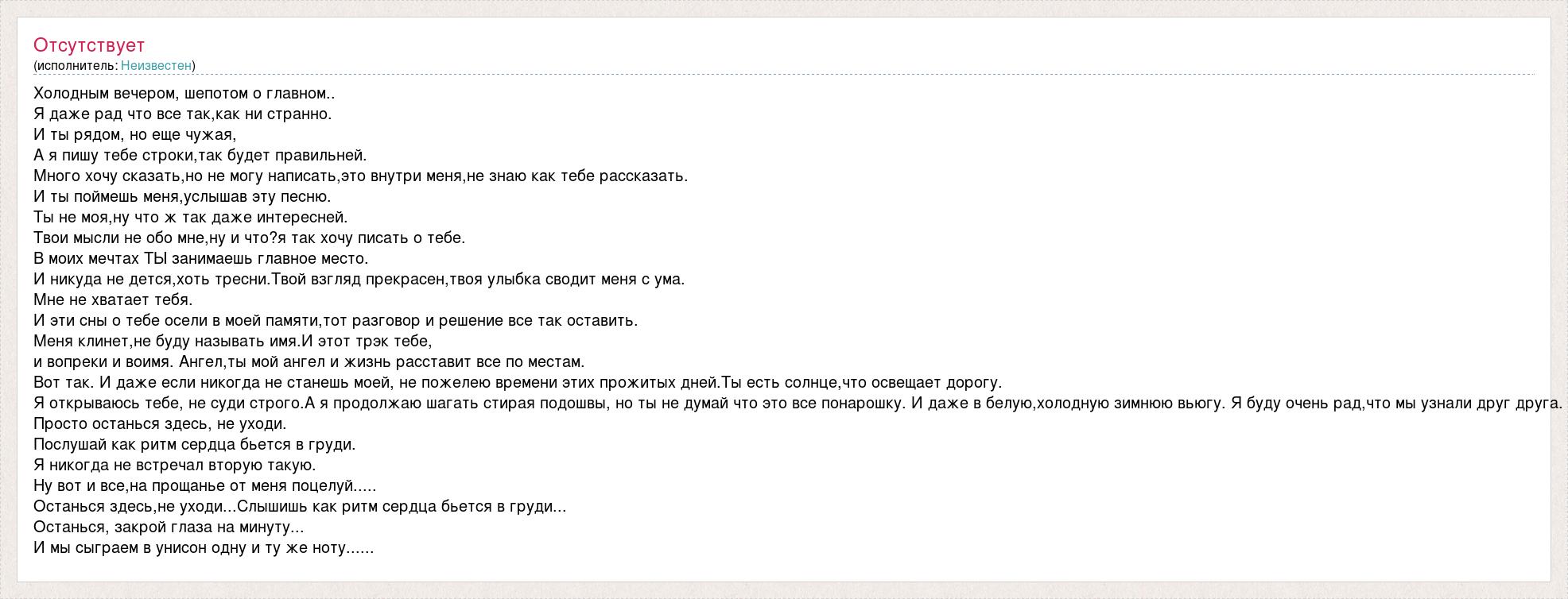 Холодным вечером, шепотом о главном.. Я даже рад что все так,как ни странно. И ты рядом, но еще чужая, А я пишу тебе строки,так будет правильней. Много хочу сказать,но не могу написать,это внутри меня,не знаю как тебе рассказать. И ты поймешь меня,услышав эту песню. Ты не моя,ну что ж так даже интересней. Твои мысли не обо мне,ну и что?я так хочу писать о тебе. В моих мечтах ТЫ занимаешь главное место. И никуда не дется,хоть тресни.Твой взгляд прекрасен,твоя улыбка сводит меня с ума. Мне не хватает тебя. И эти сны о тебе осели в моей памяти,тот разговор и решение все так оставить. Меня клинет,не буду называть имя.И этот трэк тебе, и вопреки и воимя. Ангел,ты мой ангел и жизнь расставит все по местам. Вот так. И даже если никогда не станешь моей, не пожелею времени этих прожитых дней.Ты есть солнце,что освещает дорогу. Я открываюсь тебе, не суди строго.А я продолжаю шагать стирая подошвы, но ты не думай что это все понарошку. И даже в белую,холодную зимнюю вьюгу. Я буду очень рад,что мы узнали друг друга. Просто останься здесь, не уходи. Послушай как ритм сердца бьется в груди. Я никогда не встречал вторую такую. Ну вот и все,на прощанье от меня поцелуй..... Останься здесь,не уходи...Слышишь как ритм сердца бьется в груди... Останься, закрой глаза на минуту... И мы сыграем в унисон одну и ту же ноту......