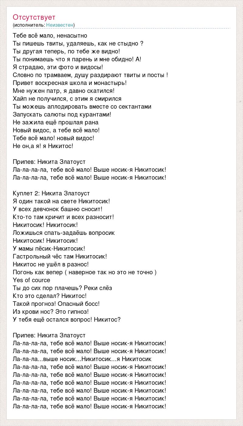 Тебе всё мало, ненасытно Ты пишешь твиты, удаляешь, как не стыдно ? Ты другая теперь, по тебе же видно! Ты понимаешь что я парень и мне обидно! А! Я страдаю, эти фото и видосы! Словно по трамваем, душу раздирают твиты и посты ! Привет воскресная школа и монастырь! Мне нужен патр, я давно скатился! Хайп не получился, с этим я смирился Ты можешь аплодировать вместе со сектантами Запускать салюты под курантами! Не зажила ещё прошлая рана Новый видос, а тебе всё мало! Тебе всё мало! новый видос! Не он,а я! я Никитос! Припев: Никита Златоуст Ла-ла-ла-ла, тебе всё мало! Выше носик-я Никитосик! Ла-ла-ла-ла, тебе всё мало! Выше носик-я Никитосик! Куплет 2: Никита Златоуст Я один такой на свете Никитосик! У всех девчонок башню сносит! Кто-то там кричит и всех разносит! Никитосик! Никитосик! Ложишься спать-задаёшь вопросик Никитосик! Никитосик! У мамы пёсик-Никитосик! Гастрольный чёс там Никитосик! Никитос не ушёл в разнос! Погонь как вепер ( наверное так но это не точно ) Yes of cource Ты до сих пор плачешь? Реки слёз Кто это сделал? Никитос! Такой прогноз! Опасный босс! Из крови нос? Это гипноз! У тебя ещё остался вопрос! Никитос? Припев: Никита Златоуст Ла-ла-ла-ла, тебе всё мало! Выше носик-я Никитосик! Ла-ла-ла-ла, тебе всё мало! Выше носик-я Никитосик! Ла-ла-ла...выше носик...Никитосик...я Никитосик Ла-ла-ла-ла, тебе всё мало! Выше носик-я Никитосик! Ла-ла-ла-ла, тебе всё мало! Выше носик-я Никитосик! Ла-ла-ла-ла, тебе всё мало! Выше носик-я Никитосик! Ла-ла-ла-ла, тебе всё мало! Выше носик-я Никитосик! Ла-ла-ла-ла, тебе всё мало! Выше носик-я Никитосик! Ла-ла-ла-ла, тебе всё мало! Выше носик-я Никитосик!