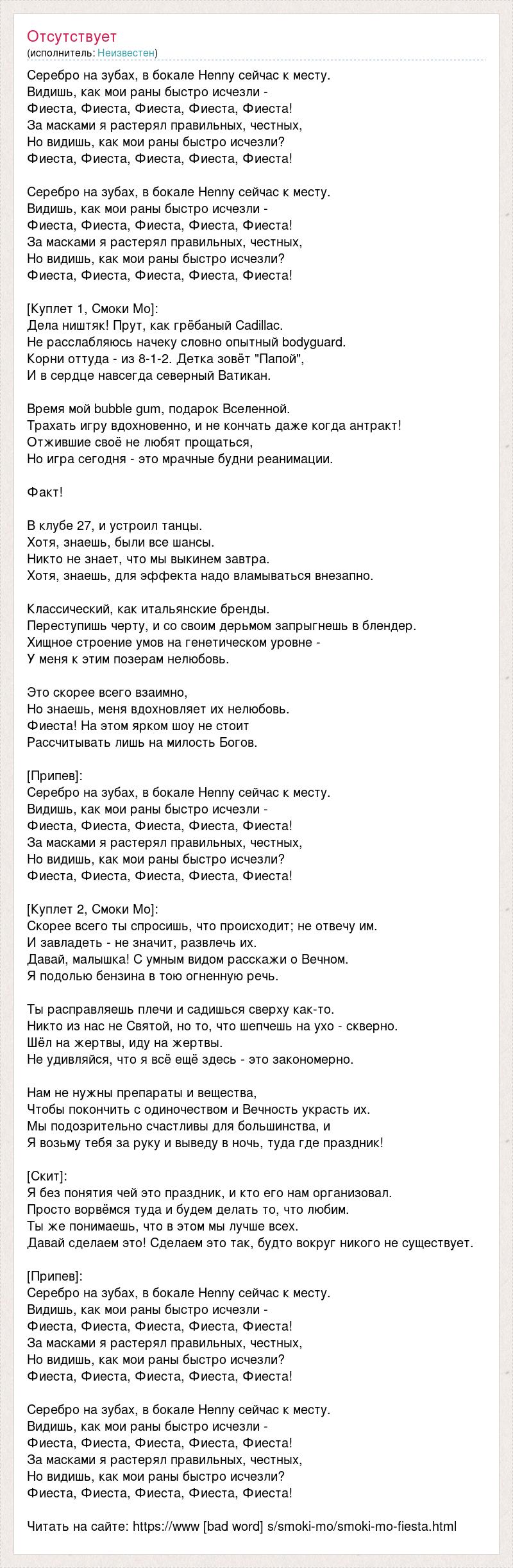 Серебро на зубах, в бокале Henny сейчас к месту. Видишь, как мои раны быстро исчезли - Фиеста, Фиеста, Фиеста, Фиеста, Фиеста! За масками я растерял правильных, честных, Но видишь, как мои раны быстро исчезли? Фиеста, Фиеста, Фиеста, Фиеста, Фиеста! Серебро на зубах, в бокале Henny сейчас к месту. Видишь, как мои раны быстро исчезли - Фиеста, Фиеста, Фиеста, Фиеста, Фиеста! За масками я растерял правильных, честных, Но видишь, как мои раны быстро исчезли? Фиеста, Фиеста, Фиеста, Фиеста, Фиеста! [Куплет 1, Смоки Мо]: Дела ништяк! Прут, как грёбаный Cadillac. Не расслабляюсь начеку словно опытный bodyguard. Корни оттуда - из 8-1-2. Детка зовёт "Папой", И в сердце навсегда северный Ватикан. Время мой bubble gum, подарок Вселенной. Трахать игру вдохновенно, и не кончать даже когда антракт! Отжившие своё не любят прощаться, Но игра сегодня - это мрачные будни реанимации. Факт! В клубе 27, и устроил танцы. Хотя, знаешь, были все шансы. Никто не знает, что мы выкинем завтра. Хотя, знаешь, для эффекта надо вламываться внезапно. Классический, как итальянские бренды. Переступишь черту, и со своим дерьмом запрыгнешь в блендер. Хищное строение умов на генетическом уровне - У меня к этим позерам нелюбовь. Это скорее всего взаимно, Но знаешь, меня вдохновляет их нелюбовь. Фиеста! На этом ярком шоу не стоит Рассчитывать лишь на милость Богов. [Припев]: Серебро на зубах, в бокале Henny сейчас к месту. Видишь, как мои раны быстро исчезли - Фиеста, Фиеста, Фиеста, Фиеста, Фиеста! За масками я растерял правильных, честных, Но видишь, как мои раны быстро исчезли? Фиеста, Фиеста, Фиеста, Фиеста, Фиеста! [Куплет 2, Смоки Мо]: Скорее всего ты спросишь, что происходит; не отвечу им. И завладеть - не значит, развлечь их. Давай, малышка! С умным видом расскажи о Вечном. Я подолью бензина в тою огненную речь. Ты расправляешь плечи и садишься сверху как-то. Никто из нас не Святой, но то, что шепчешь на ухо - скверно. Шёл на жертвы, иду на жертвы. Не удивляйся, что я всё ещё здесь - это закономерно. Нам не нужны препараты и вещества, Чтобы покончить с одиночеством и Вечность украсть их. Мы подозрительно счастливы для большинства, и Я возьму тебя за руку и выведу в ночь, туда где праздник! [Скит]: Я без понятия чей это праздник, и кто его нам организовал. Просто ворвёмся туда и будем делать то, что любим. Ты же понимаешь, что в этом мы лучше всех. Давай сделаем это! Сделаем это так, будто вокруг никого не существует. [Припев]: Серебро на зубах, в бокале Henny сейчас к месту. Видишь, как мои раны быстро исчезли - Фиеста, Фиеста, Фиеста, Фиеста, Фиеста! За масками я растерял правильных, честных, Но видишь, как мои раны быстро исчезли? Фиеста, Фиеста, Фиеста, Фиеста, Фиеста! Серебро на зубах, в бокале Henny сейчас к месту. Видишь, как мои раны быстро исчезли - Фиеста, Фиеста, Фиеста, Фиеста, Фиеста! За масками я растерял правильных, честных, Но видишь, как мои раны быстро исчезли? Фиеста, Фиеста, Фиеста, Фиеста, Фиеста! Читать на сайте: https://www [bad word] s/smoki-mo/smoki-mo-fiesta.html
