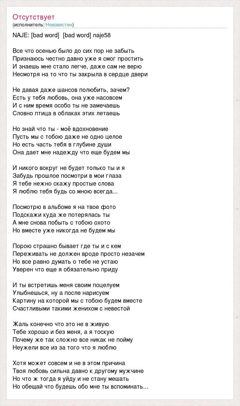 NAJE: [bad word] [bad word] naje58 Все что осенью было до сих пор не забыть Признаюсь честно давно уже я смог простить И знаешь мне стало легче, даже сам не верю Несмотря на то что ты закрыла в сердце двери Не давая даже шансов полюбить, зачем? Есть у тебя любовь, она уже насовсем И с ним время особо ты не замечаешь Словно птица в облаках этих летаешь Но знай что ты - моё вдохновение Пусть мы с тобою даже не одно целое Но есть часть тебя в глубине души Она дает мне надежду что еще будем мы И никого вокруг не будет только ты и я Забудь прошлое посмотри в мои глаза Я тебе нежно скажу простые слова Я люблю тебя будь со мною всегда... Посмотрю в альбоме я на твое фото Подскажи куда же потерялась ты А мне снова побыть с тобою охото Но вместе уже никогда не будем мы Порою страшно бывает где ты и с кем Переживать не должен вроде просто незачем Но все равно думать о тебе не устаю Уверен что еще я обязательно приду И ты встретишь меня своим поцелуем Улыбнешься, ну а после нарисуем Картину на которой мы с тобою будем вместе Счастливыми такими женихом с невестой Жаль конечно что это не в живую Тебе хорошо и без меня, а я тоскую Почему же так сложно все никак не пойму Неужели все из за того что я люблю Хотя может совсем и не в этом причина Твоя любовь сильна давно к другому мужчине Но что ж тогда я уйду и не стану мешать Но обещай что будешь обо мне ты вспоминать...