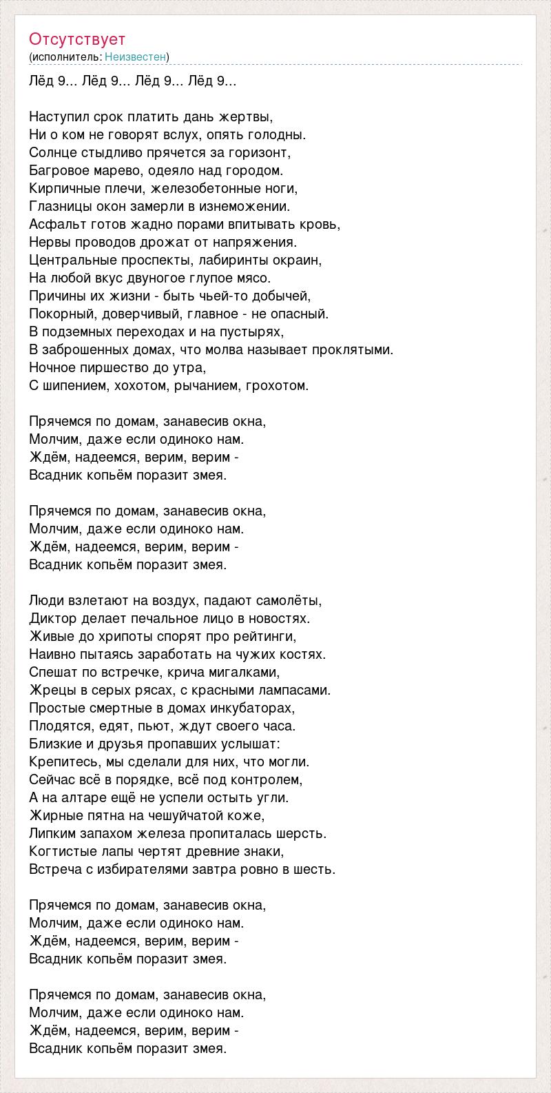 Лёд 9... Лёд 9... Лёд 9... Лёд 9... Наступил срок платить дань жертвы, Ни о ком не говорят вслух, опять голодны. Солнце стыдливо прячется за горизонт, Багровое марево, одеяло над городом. Кирпичные плечи, железобетонные ноги, Глазницы окон замерли в изнеможении. Асфальт готов жадно порами впитывать кровь, Нервы проводов дрожат от напряжения. Центральные проспекты, лабиринты окраин, На любой вкус двуногое глупое мясо. Причины их жизни - быть чьей-то добычей, Покорный, доверчивый, главное - не опасный. В подземных переходах и на пустырях, В заброшенных домах, что молва называет проклятыми. Ночное пиршество до утра, С шипением, хохотом, рычанием, грохотом. Прячемся по домам, занавесив окна, Молчим, даже если одиноко нам. Ждём, надеемся, верим, верим - Всадник копьём поразит змея. Прячемся по домам, занавесив окна, Молчим, даже если одиноко нам. Ждём, надеемся, верим, верим - Всадник копьём поразит змея. Люди взлетают на воздух, падают самолёты, Диктор делает печальное лицо в новостях. Живые до хрипоты спорят про рейтинги, Наивно пытаясь заработать на чужих костях. Спешат по встречке, крича мигалками, Жрецы в серых рясах, с красными лампасами. Простые смертные в домах инкубаторах, Плодятся, едят, пьют, ждут своего часа. Близкие и друзья пропавших услышат: Крепитесь, мы сделали для них, что могли. Сейчас всё в порядке, всё под контролем, А на алтаре ещё не успели остыть угли. Жирные пятна на чешуйчатой коже, Липким запахом железа пропиталась шерсть. Когтистые лапы чертят древние знаки, Встреча с избирателями завтра ровно в шесть. Прячемся по домам, занавесив окна, Молчим, даже если одиноко нам. Ждём, надеемся, верим, верим - Всадник копьём поразит змея. Прячемся по домам, занавесив окна, Молчим, даже если одиноко нам. Ждём, надеемся, верим, верим - Всадник копьём поразит змея.