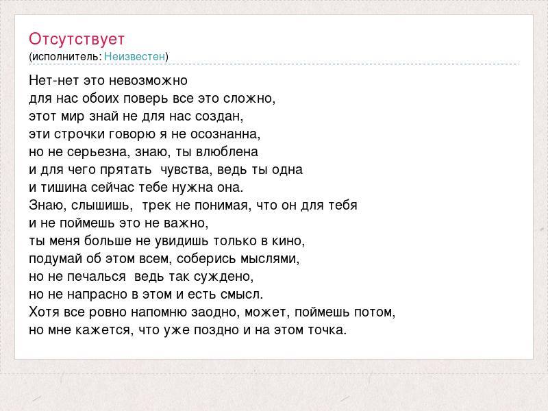 Нет-нет это невозможно для нас обоих поверь все это сложно, этот мир знай не для нас создан, эти строчки говорю я не осознанна, но не серьезна, знаю, ты влюблена и для чего прятать чувства, ведь ты одна и тишина сейчас тебе нужна она. Знаю, слышишь, трек не понимая, что он для тебя и не поймешь это не важно, ты меня больше не увидишь только в кино, подумай об этом всем, соберись мыслями, но не печалься ведь так суждено, но не напрасно в этом и есть смысл. Хотя все ровно напомню заодно, может, поймешь потом, но мне кажется, что уже поздно и на этом точка.