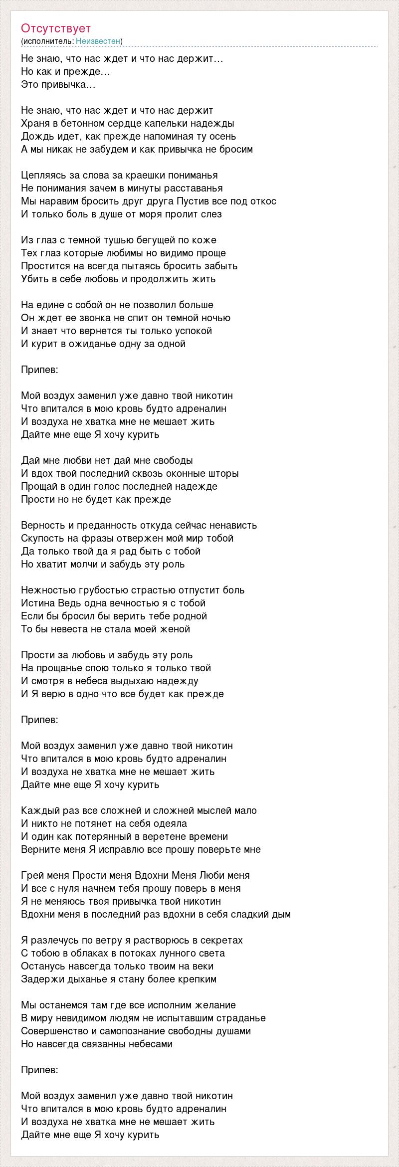 Не знаю, что нас ждет и что нас держит… Но как и прежде… Это привычка… Не знаю, что нас ждет и что нас держит Храня в бетонном сердце капельки надежды Дождь идет, как прежде напоминая ту осень А мы никак не забудем и как привычка не бросим Цепляясь за слова за краешки пониманья Не понимания зачем в минуты расставанья Мы наравим бросить друг друга Пустив все под откос И только боль в душе от моря пролит слез Из глаз с темной тушью бегущей по коже Тех глаз которые любимы но видимо проще Простится на всегда пытаясь бросить забыть Убить в себе любовь и продолжить жить На едине с собой он не позволил больше Он ждет ее звонка не спит он темной ночью И знает что вернется ты только успокой И курит в ожиданье одну за одной Припев: Мой воздух заменил уже давно твой никотин Что впитался в мою кровь будто адреналин И воздуха не хватка мне не мешает жить Дайте мне еще Я хочу курить Дай мне любви нет дай мне свободы И вдох твой последний сквозь оконные шторы Прощай в один голос последней надежде Прости но не будет как прежде Верность и преданность откуда сейчас ненависть Скупость на фразы отвержен мой мир тобой Да только твой да я рад быть с тобой Но хватит молчи и забудь эту роль Нежностью грубостью страстью отпустит боль Истина Ведь одна вечностью я с тобой Если бы бросил бы верить тебе родной То бы невеста не стала моей женой Прости за любовь и забудь эту роль На прощанье спою только я только твой И смотря в небеса выдыхаю надежду И Я верю в одно что все будет как прежде Припев: Мой воздух заменил уже давно твой никотин Что впитался в мою кровь будто адреналин И воздуха не хватка мне не мешает жить Дайте мне еще Я хочу курить Каждый раз все сложней и сложней мыслей мало И никто не потянет на себя одеяла И один как потерянный в веретене времени Верните меня Я исправлю все прошу поверьте мне Грей меня Прости меня Вдохни Меня Люби меня И все с нуля начнем тебя прошу поверь в меня Я не меняюсь твоя привычка твой никотин Вдохни меня в последний раз вдохни в себя сладкий дым Я разлечусь по ветру я растворюсь в секретах С тобою в облаках в потоках лунного света Останусь навсегда только твоим на веки Задержи дыханье я стану более крепким Мы останемся там где все исполним желание В миру невидимом людям не испытавшим страданье Совершенство и самопознание свободны душами Но навсегда связанны небесами Припев: Мой воздух заменил уже давно твой никотин Что впитался в мою кровь будто адреналин И воздуха не хватка мне не мешает жить Дайте мне еще Я хочу курить