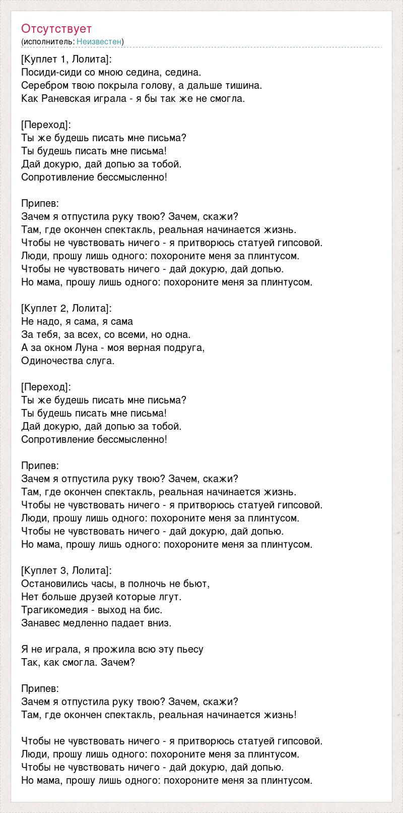 [Куплет 1, Лолита]: Посиди-сиди со мною седина, седина. Серебром твою покрыла голову, а дальше тишина. Как Раневская играла - я бы так же не смогла. [Переход]: Ты же будешь писать мне письма? Ты будешь писать мне письма! Дай докурю, дай допью за тобой. Сопротивление бессмысленно! Припев: Зачем я отпустила руку твою? Зачем, скажи? Там, где окончен спектакль, реальная начинается жизнь. Чтобы не чувствовать ничего - я притворюсь статуей гипсовой. Люди, прошу лишь одного: похороните меня за плинтусом. Чтобы не чувствовать ничего - дай докурю, дай допью. Но мама, прошу лишь одного: похороните меня за плинтусом. [Куплет 2, Лолита]: Не надо, я сама, я сама За тебя, за всех, со всеми, но одна. А за окном Луна - моя верная подруга, Одиночества слуга. [Переход]: Ты же будешь писать мне письма? Ты будешь писать мне письма! Дай докурю, дай допью за тобой. Сопротивление бессмысленно! Припев: Зачем я отпустила руку твою? Зачем, скажи? Там, где окончен спектакль, реальная начинается жизнь. Чтобы не чувствовать ничего - я притворюсь статуей гипсовой. Люди, прошу лишь одного: похороните меня за плинтусом. Чтобы не чувствовать ничего - дай докурю, дай допью. Но мама, прошу лишь одного: похороните меня за плинтусом. [Куплет 3, Лолита]: Остановились часы, в полночь не бьют, Нет больше друзей которые лгут. Трагикомедия - выход на бис. Занавес медленно падает вниз. Я не играла, я прожила всю эту пьеcу Так, как смогла. Зачем? Припев: Зачем я отпустила руку твою? Зачем, скажи? Там, где окончен спектакль, реальная начинается жизнь! Чтобы не чувствовать ничего - я притворюсь статуей гипсовой. Люди, прошу лишь одного: похороните меня за плинтусом. Чтобы не чувствовать ничего - дай докурю, дай допью. Но мама, прошу лишь одного: похороните меня за плинтусом.