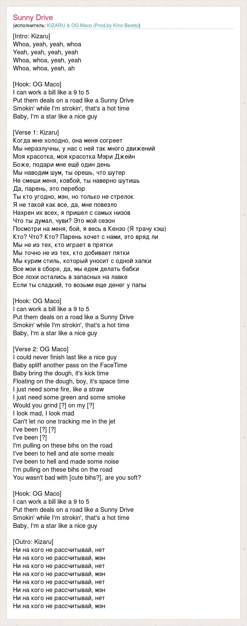 [Intro: Kizaru] Whoa, yeah, yeah, whoa Yeah, yeah, yeah, yeah Whoa, whoa, yeah, yeah Whoa, whoa, yeah, ah [Hook: OG Maco] I can work a bill like a 9 to 5 Put them deals on a road like a Sunny Drive Smokin' while I'm strokin', that's a hot time Baby, I'm a star like a nice guy [Verse 1: Kizaru] Когда мне холодно, она меня согреет Мы неразлучны, у нас с ней так много движений Моя красотка, моя красотка Мэри Джейн Боже, подари мне ещё один день Мы наводим шум, ты орешь, что шутер Не смеши меня, ковбой, ты наверно шутишь Да, парень, это перебор Ты кто угодно, мэн, но только не стрелок Я не такой как все, да, мне повезло Нахрен их всех, я пришел с самых низов Что ты думал, чуви? Это мой сезон Посмотри на меня, бой, я весь в Кензо (Я трачу кэш) Кто? Что? Кто? Парень хочет с нами, это вряд ли Мы не из тех, кто играет в прятки Мы точно не из тех, кто добивает пятки Мы курим стиль, который уносит с одной хапки Все мои в сборе, да, мы едем делать бабки Все лохи остались в запасных на лавке Если ты сладкий, то возьми еще денег у папы [Hook: OG Maco] I can work a bill like a 9 to 5 Put them deals on a road like a Sunny Drive Smokin' while I'm strokin', that's a hot time Baby, I'm a star like a nice guy [Verse 2: OG Maco] I could never finish last like a nice guy Baby spliff another pass on the FaceTime Baby bring the dough, it's kick time Floating on the dough, boy, it's space time I just need some fire, like a straw I just need some green and some smoke Would you grind [?] on my [?] I look mad, I look mad Can't let no one tracking me in the jet I've been [?] [?] I've been [?] I'm pulling on these bihs on the road I've been to hell and ate some meals I've been to hell and made some noise I'm pulling on these bihs on the road You wasn't bad with [cute bihs?], are you soft? [Hook: OG Maco] I can work a bill like a 9 to 5 Put them deals on a road like a Sunny Drive Smokin' while I'm strokin', that's a hot time Baby, I'm a star like a nice guy [Outro: Kizaru] Ни на кого не рассчитывай, нет Ни на кого не рассчитывай, мэн Ни на кого не рассчитывай, нет Ни на кого не рассчитывай, мэн Ни на кого не рассчитывай, нет Ни на кого не рассчитывай, мэн Ни на кого не рассчитывай, нет Ни на кого не рассчитывай, мэн