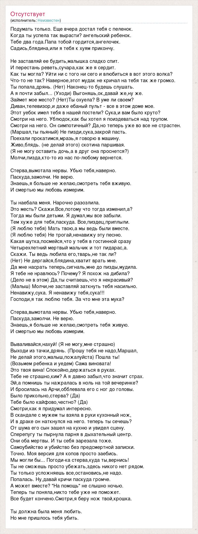 Подумать только. Еще вчера достал тебя с пеленок. Когда ты успела так вырасти? ангельский ребенок. Тебе два года.Папа тобой гордится,ангелочек. Садись,блядина,или я тебя к хуям прикончу. Не заставляй ее будить,малышка сладко спит. И перестань реветь,сучара,как же я сердит. Как ты могла? Уйти ни с того ни сего и влюбиться в вот этого волка? Что-то не так? Наверное,этот мудак не кричал на тебя так же громко. Ты попала,дрянь. (Нет) Наконец-то будешь слушать. А я почти забыл... (Уходи) Выгоняшь,ок,давай же,ну же. Займет мое место? (Нет)Ты охуела? В уме ли своем? Диван,телевизор,и даже ебаный пульт - все в этом доме мое. Этот уебок имел тебя в нашей постели? Сука,и вам было круто? Смотри на него. Ублюдок,как бы хотел я поиздеваться над трупом. Смотри на него. Он симпотичный? Да,но теперь уже во все не страстен. (Маршал,ты пьяный) Не пизди,сука,закрой пасть. Поехали прокатимся,мразь,я говорю в машину. Живо,блядь. (не делай этого) скотина паршивая. (Я не могу оставить дочь,а в друг она проснется?) Молчи,пизда,кто-то из нас по-любому вернется. Стерва,вымотала нервы. Убью тебя,наверно. Паскуда,замолчи. Не верю. Знаешь,я больше не желаю,смотреть тебя вживую. И смертью мы любовь измерим. Ты наебала меня. Нарочно разозлила. Это месть? Скажи.Все,потому что тогда изменил,а? Тогда мы были детьми. Я думал,мы все забыли. Тем хуже для тебя,паскуда. Все,пиздец,приплыли. (Я люблю тебя) Мать твою,а мы ведь были вместе. (Я люблю тебя) Не трогай,ненавижу эту песню. Какая шутка,посмейся,что у тебя в гостинной сразу Четырехлетний мертвый мальчик и тот пидарас,а. Скажи. Ты ведь любила его,тварь,не так ли? (Нет) Не дергайся,блядина,хватит врать мне. Да мне насрать теперь,сигналь,мне до пизды,мудила. Я тебе не нравлюсь? Почему? Я похож на дибила? (Дело не в этом) Да,ты считаешь,что я некрасивый? (Малыш) Молчи,не заставляй заткнуть тебя насильно. Ненавижу,сука. Я ненавижу тебя,сука!!! Господи,я так люблю тебя. За что мне эта мука? Стерва,вымотала нервы. Убью тебя,наверно. Паскуда,замолчи. Не верю. Знаешь,я больше не желаю,смотреть тебя живую. И смертью мы любовь измерим. Вываливайся,нахуй! (Я не могу,мне страшно) Выходи из тачки,дрянь. (Прошу тебя не надо,Маршал, Не делай этого,малыш,пожалуйста) Пошла ты! (Возьмем ребенка и уедем) Сама виновата! Это твоя вина! Спокойно,держаться в руках. Тебе не страшно,ким? А я давно забыл,что значит страх. Эй,а помнишь ты нажралась в ноль на той вечеринке? И бросилась на Арчи,обблевала его с ног до головы. Было прикольно,стерва? (Да) Тебе было кайфово,честно? (Да) Смотри,как я придумал интересно. В скандале с мужем ты взяла в руки кухонный нож, И в драке он наткнулся на него. теперь ты сечешь? От шума его сын зашел на кухню и увидел сцену. Сперепугу ты пырнула парня в дыхательный центр. Они оба мертвы. И ты себя зарезала тоже. Самоубийство и убийство без предсмертной записки. Точно. Моя версия для копов просто заебись. Мы могли бы... Погоди-ка стерва,куда ты,вернись! Ты не сможешь просто убежать,здесь никого нет рядом. Ты только усложняешь все,остановись,не надо. Попалась. Ну,давай кричи паскуда громче. А может вместе? "На помощь" не слышно ночью. Теперь ты поняла,никто тебе уже не поможет. Все будет кончено.Смотри,я беру нож твой,крошка. Ты должна была меня любить. Но мне пришлось тебя убить.