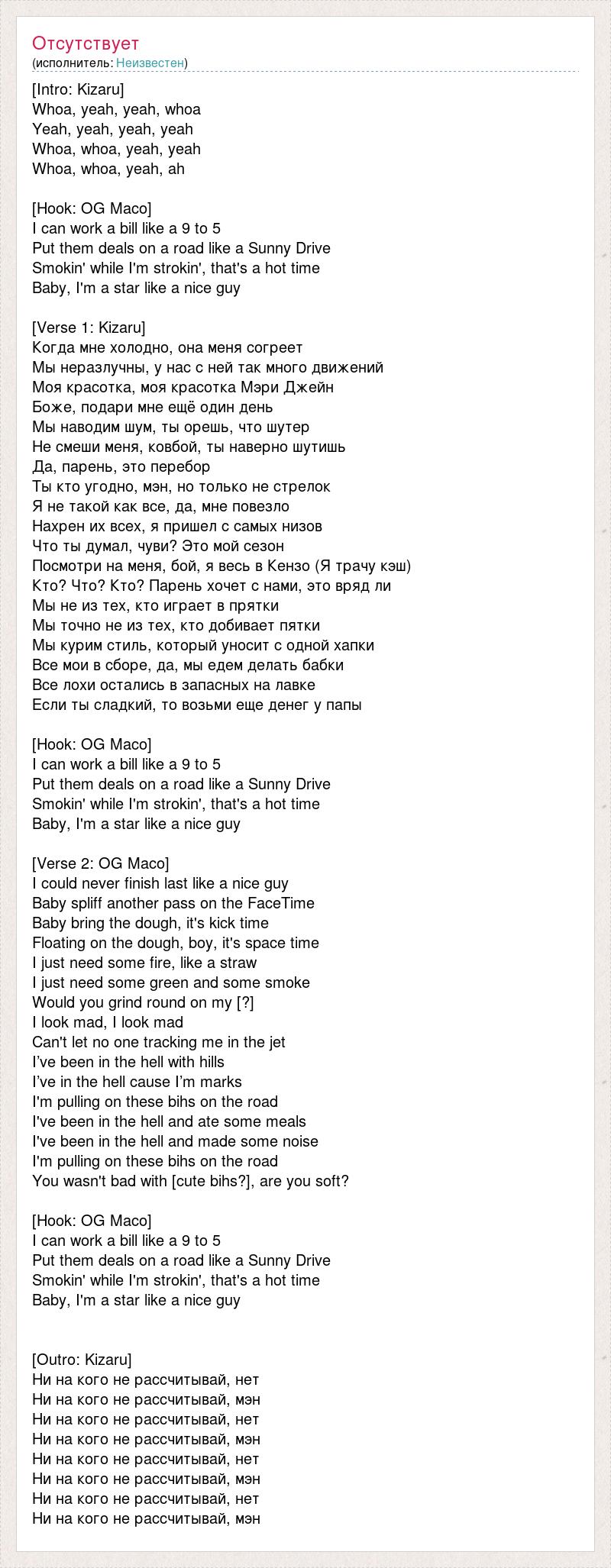 [Intro: Kizaru] Whoa, yeah, yeah, whoa Yeah, yeah, yeah, yeah Whoa, whoa, yeah, yeah Whoa, whoa, yeah, ah [Hook: OG Maco] I can work a bill like a 9 to 5 Put them deals on a road like a Sunny Drive Smokin' while I'm strokin', that's a hot time Baby, I'm a star like a nice guy [Verse 1: Kizaru] Когда мне холодно, она меня согреет Мы неразлучны, у нас с ней так много движений Моя красотка, моя красотка Мэри Джейн Боже, подари мне ещё один день Мы наводим шум, ты орешь, что шутер Не смеши меня, ковбой, ты наверно шутишь Да, парень, это перебор Ты кто угодно, мэн, но только не стрелок Я не такой как все, да, мне повезло Нахрен их всех, я пришел с самых низов Что ты думал, чуви? Это мой сезон Посмотри на меня, бой, я весь в Кензо (Я трачу кэш) Кто? Что? Кто? Парень хочет с нами, это вряд ли Мы не из тех, кто играет в прятки Мы точно не из тех, кто добивает пятки Мы курим стиль, который уносит с одной хапки Все мои в сборе, да, мы едем делать бабки Все лохи остались в запасных на лавке Если ты сладкий, то возьми еще денег у папы [Hook: OG Maco] I can work a bill like a 9 to 5 Put them deals on a road like a Sunny Drive Smokin' while I'm strokin', that's a hot time Baby, I'm a star like a nice guy [Verse 2: OG Maco] I could never finish last like a nice guy Baby spliff another pass on the FaceTime Baby bring the dough, it's kick time Floating on the dough, boy, it's space time I just need some fire, like a straw I just need some green and some smoke Would you grind round on my [?] I look mad, I look mad Can't let no one tracking me in the jet I’ve been in the hell with hills I’ve in the hell cause I’m marks I'm pulling on these bihs on the road I've been in the hell and ate some meals I've been in the hell and made some noise I'm pulling on these bihs on the road You wasn't bad with [cute bihs?], are you soft? [Hook: OG Maco] I can work a bill like a 9 to 5 Put them deals on a road like a Sunny Drive Smokin' while I'm strokin', that's a hot time Baby, I'm a star like a nice guy [Outro: Kizaru] Ни на кого не рассчитывай, нет Ни на кого не рассчитывай, мэн Ни на кого не рассчитывай, нет Ни на кого не рассчитывай, мэн Ни на кого не рассчитывай, нет Ни на кого не рассчитывай, мэн Ни на кого не рассчитывай, нет Ни на кого не рассчитывай, мэн
