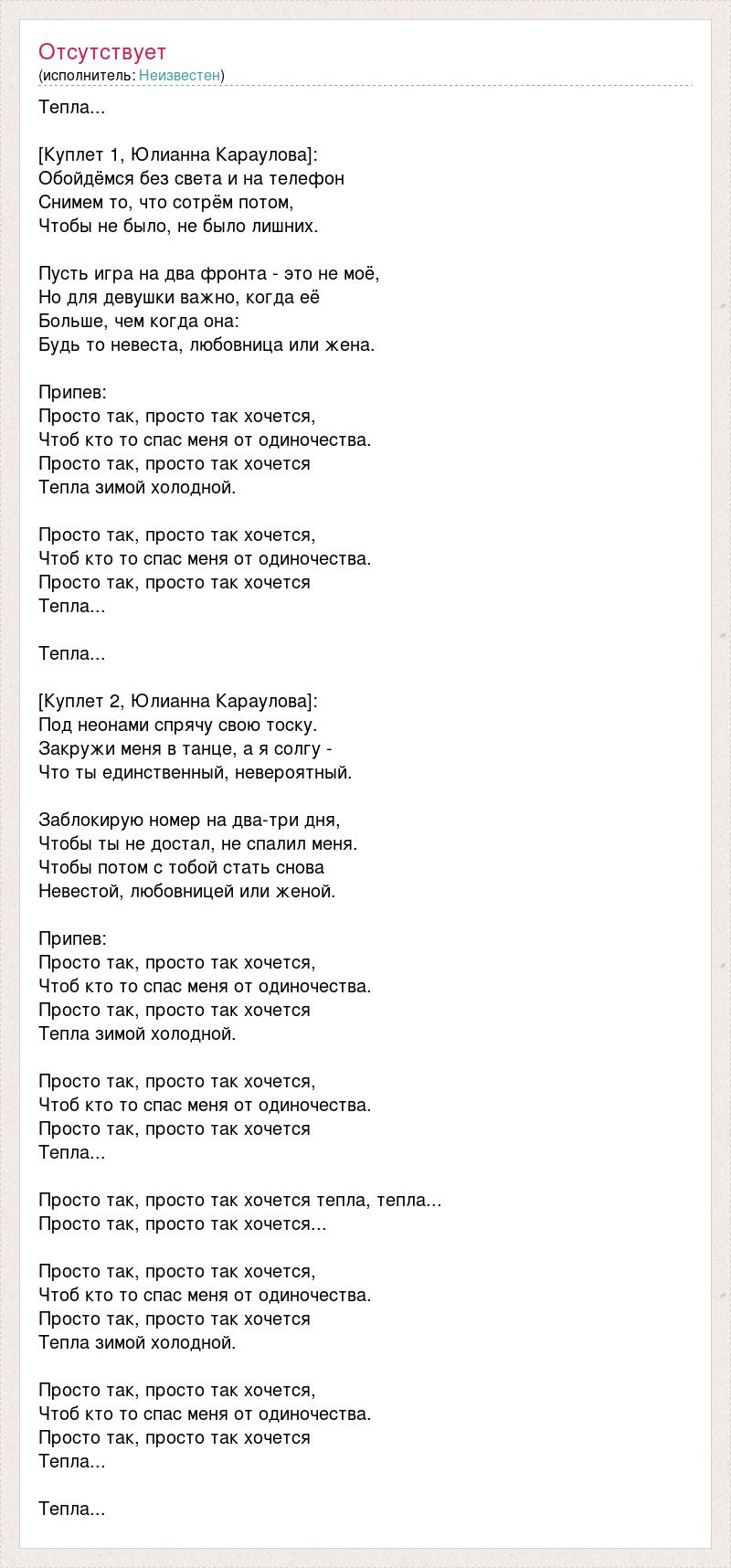 Тепла... [Куплет 1, Юлианна Караулова]: Обойдёмся без света и на телефон Снимем то, что сотрём потом, Чтобы не было, не было лишних. Пусть игра на два фронта - это не моё, Но для девушки важно, когда её Больше, чем когда она: Будь то невеста, любовница или жена. Припев: Просто так, просто так хочется, Чтоб кто то спас меня от одиночества. Просто так, просто так хочется Тепла зимой холодной. Просто так, просто так хочется, Чтоб кто то спас меня от одиночества. Просто так, просто так хочется Тепла... Тепла... [Куплет 2, Юлианна Караулова]: Под неонами спрячу свою тоску. Закружи меня в танце, а я солгу - Что ты единственный, невероятный. Заблокирую номер на два-три дня, Чтобы ты не достал, не спалил меня. Чтобы потом с тобой стать снова Невестой, любовницей или женой. Припев: Просто так, просто так хочется, Чтоб кто то спас меня от одиночества. Просто так, просто так хочется Тепла зимой холодной. Просто так, просто так хочется, Чтоб кто то спас меня от одиночества. Просто так, просто так хочется Тепла... Просто так, просто так хочется тепла, тепла... Просто так, просто так хочется... Просто так, просто так хочется, Чтоб кто то спас меня от одиночества. Просто так, просто так хочется Тепла зимой холодной. Просто так, просто так хочется, Чтоб кто то спас меня от одиночества. Просто так, просто так хочется Тепла... Тепла...