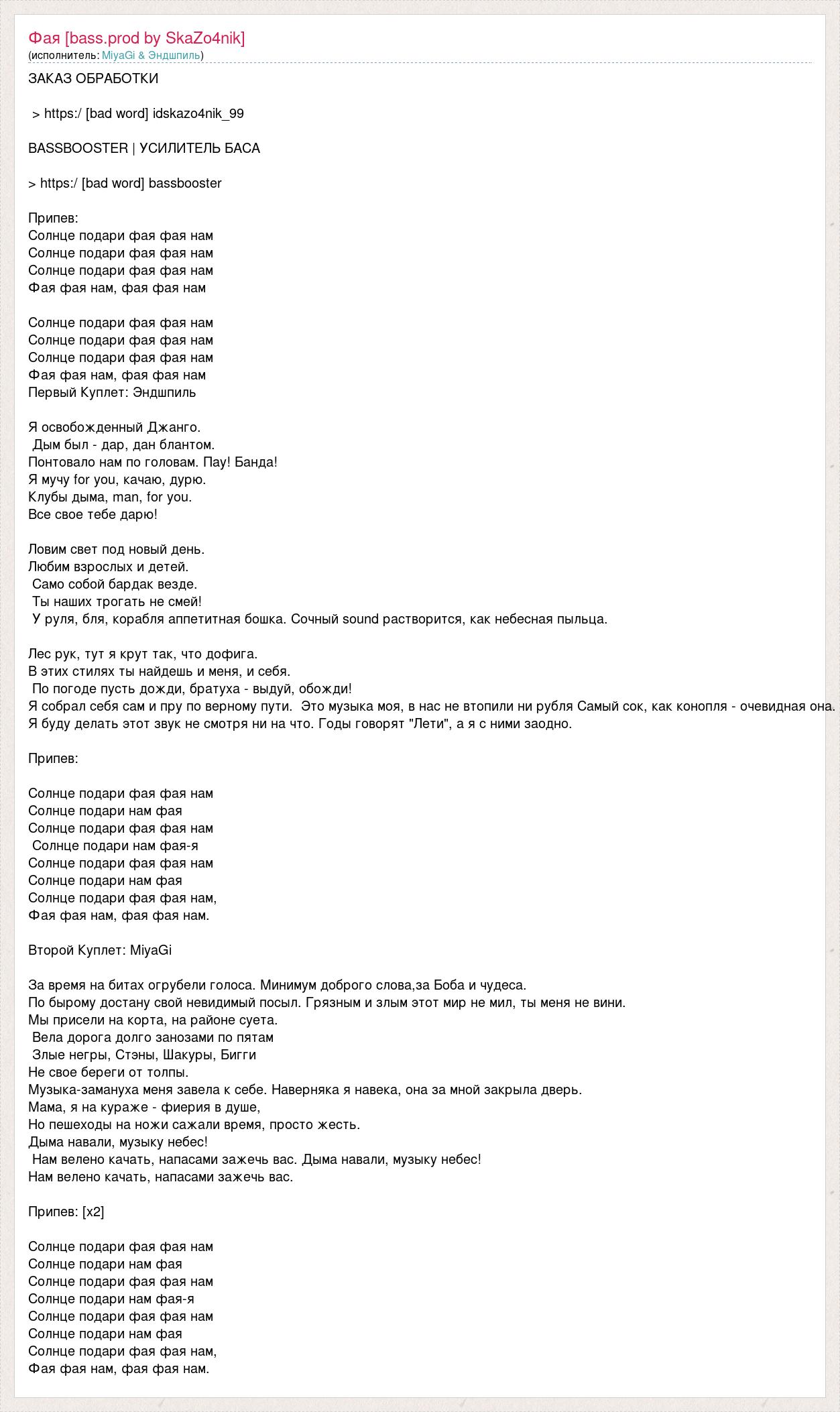 ЗАКАЗ ОБРАБОТКИ > https:/ [bad word] idskazo4nik_99 BASSBOOSTER | УСИЛИТЕЛЬ БАСА > https:/ [bad word] bassbooster Припев: Солнце подари фая фая нам Солнце подари фая фая нам Солнце подари фая фая нам Фая фая нам, фая фая нам Солнце подари фая фая нам Солнце подари фая фая нам Солнце подари фая фая нам Фая фая нам, фая фая нам Первый Куплет: Эндшпиль Я освобожденный Джанго. Дым был - дар, дан блантом. Понтовало нам по головам. Пау! Банда! Я мучу for you, качаю, дурю. Клубы дыма, man, for you. Все свое тебе дарю! Ловим свет под новый день. Любим взрослых и детей. Само собой бардак везде. Ты наших трогать не смей! У руля, бля, корабля аппетитная бошка. Сочный sound растворится, как небесная пыльца. Лес рук, тут я крут так, что дофига. В этих стилях ты найдешь и меня, и себя. По погоде пусть дожди, братуха - выдуй, обожди! Я собрал себя сам и пру по верному пути. Это музыка моя, в нас не втопили ни рубля Самый сок, как конопля - очевидная она. Я буду делать этот звук не смотря ни на что. Годы говорят "Лети", а я с ними заодно. Припев: Солнце подари фая фая нам Солнце подари нам фая Солнце подари фая фая нам Солнце подари нам фая-я Солнце подари фая фая нам Солнце подари нам фая Солнце подари фая фая нам, Фая фая нам, фая фая нам. Второй Куплет: MiyaGi За время на битах огрубели голоса. Минимум доброго слова,за Боба и чудеса. По бырому достану свой невидимый посыл. Грязным и злым этот мир не мил, ты меня не вини. Мы присели на корта, на районе суета. Вела дорога долго занозами по пятам Злые негры, Стэны, Шакуры, Бигги Не свое береги от толпы. Музыка-замануха меня завела к себе. Наверняка я навека, она за мной закрыла дверь. Мама, я на кураже - фиерия в душе, Но пешеходы на ножи сажали время, просто жесть. Дыма навали, музыку небес! Нам велено качать, напасами зажечь вас. Дыма навали, музыку небес! Нам велено качать, напасами зажечь вас. Припев: [х2] Солнце подари фая фая нам Солнце подари нам фая Солнце подари фая фая нам Солнце подари нам фая-я Солнце подари фая фая нам Солнце подари нам фая Солнце подари фая фая нам, Фая фая нам, фая фая нам.