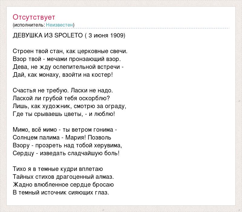 ДЕВУШКА ИЗ SPOLETO ( 3 июня 1909) Строен твой стан, как церковные свечи. Взор твой - мечами пронзающий взор. Дева, не жду ослепительной встречи - Дай, как монаху, взойти на костер! Счастья не требую. Ласки не надо. Лаской ли грубой тебя оскорблю? Лишь, как художник, смотрю за ограду, Где ты срываешь цветы, - и люблю! Мимо, всё мимо - ты ветром гонима - Солнцем палима - Мария! Позволь Взору - прозреть над тобой херувима, Сердцу - изведать сладчайшую боль! Тихо я в темные кудри вплетаю Тайных стихов драгоценный алмаз. Жадно влюбленное сердце бросаю В темный источник сияющих глаз.