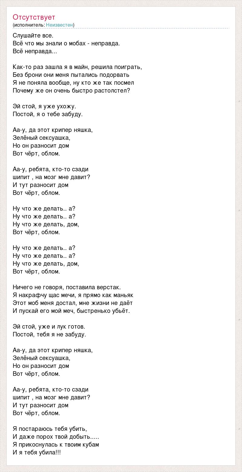 Слушайте все. Всё что мы знали о мобах - неправда. Всё неправда... Как-то раз зашла я в майн, решила поиграть, Без брони они меня пытались подорвать Я не поняла вообще, ну кто же так посмел Почему же он очень быстро растолстел? Эй стой, я уже ухожу. Постой, я о тебе забуду. Аа-у, да этот крипер няшка, Зелёный сексуашка, Но он разносит дом Вот чёрт, облом. Аа-у, ребята, кто-то сзади шипит , на мозг мне давит? И тут разносит дом Вот чёрт, облом. Ну что же делать.. а? Ну что же делать.. а? Ну что же делать, дом, Вот чёрт, облом. Ну что же делать.. а? Ну что же делать.. а? Ну что же делать, дом, Вот чёрт, облом. Ничего не говоря, поставила верстак. Я накрафчу щас мечи, я прямо как маньяк Этот моб меня достал, мне жизни не даёт И пускай его мой меч, быстренько убьёт. Эй стой, уже и лук готов. Постой, тебя я не забуду. Аа-у, да этот крипер няшка, Зелёный сексуашка, Но он разносит дом Вот чёрт, облом. Аа-у, ребята, кто-то сзади шипит , на мозг мне давит? И тут разносит дом Вот чёрт, облом. Я постараюсь тебя убить, И даже порох твой добыть..... Я прикоснулась к твоим кубам И я тебя убила!!!