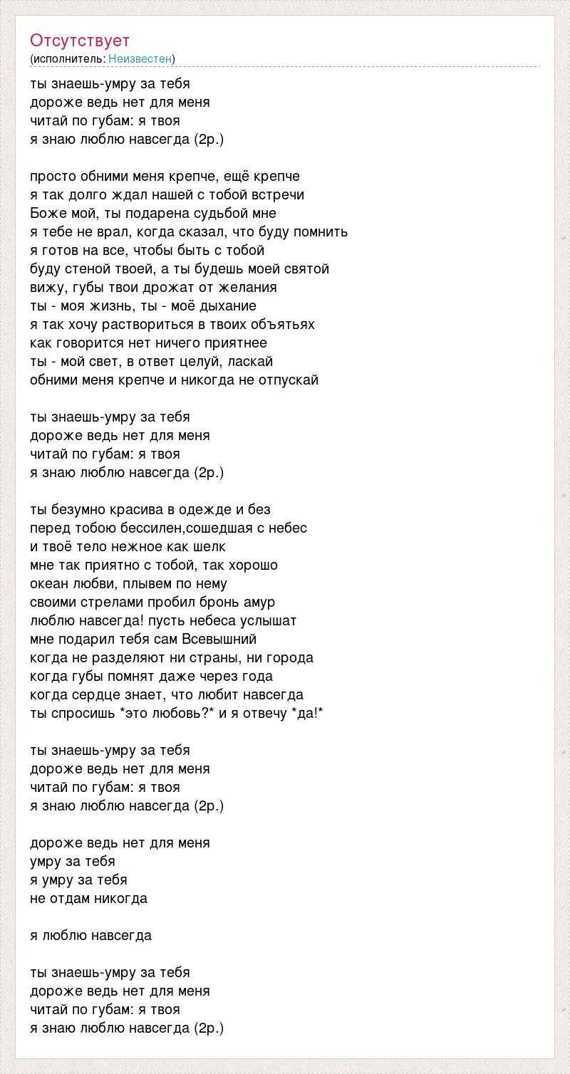 ты знаешь-умру за тебя дороже ведь нет для меня читай по губам: я твоя я знаю люблю навсегда (2р.) просто обними меня крепче, ещё крепче я так долго ждал нашей с тобой встречи Боже мой, ты подарена судьбой мне я тебе не врал, когда сказал, что буду помнить я готов на все, чтобы быть с тобой буду стеной твоей, а ты будешь моей святой вижу, губы твои дрожат от желания ты - моя жизнь, ты - моё дыхание я так хочу раствориться в твоих объятьях как говорится нет ничего приятнее ты - мой свет, в ответ целуй, ласкай обними меня крепче и никогда не отпускай ты знаешь-умру за тебя дороже ведь нет для меня читай по губам: я твоя я знаю люблю навсегда (2р.) ты безумно красива в одежде и без перед тобою бессилен,сошедшая с небес и твоё тело нежное как шелк мне так приятно с тобой, так хорошо океан любви, плывем по нему своими стрелами пробил бронь амур люблю навсегда! пусть небеса услышат мне подарил тебя сам Всевышний когда не разделяют ни страны, ни города когда губы помнят даже через года когда сердце знает, что любит навсегда ты спросишь *это любовь?* и я отвечу *да!* ты знаешь-умру за тебя дороже ведь нет для меня читай по губам: я твоя я знаю люблю навсегда (2р.) дороже ведь нет для меня умру за тебя я умру за тебя не отдам никогда я люблю навсегда ты знаешь-умру за тебя дороже ведь нет для меня читай по губам: я твоя я знаю люблю навсегда (2р.)