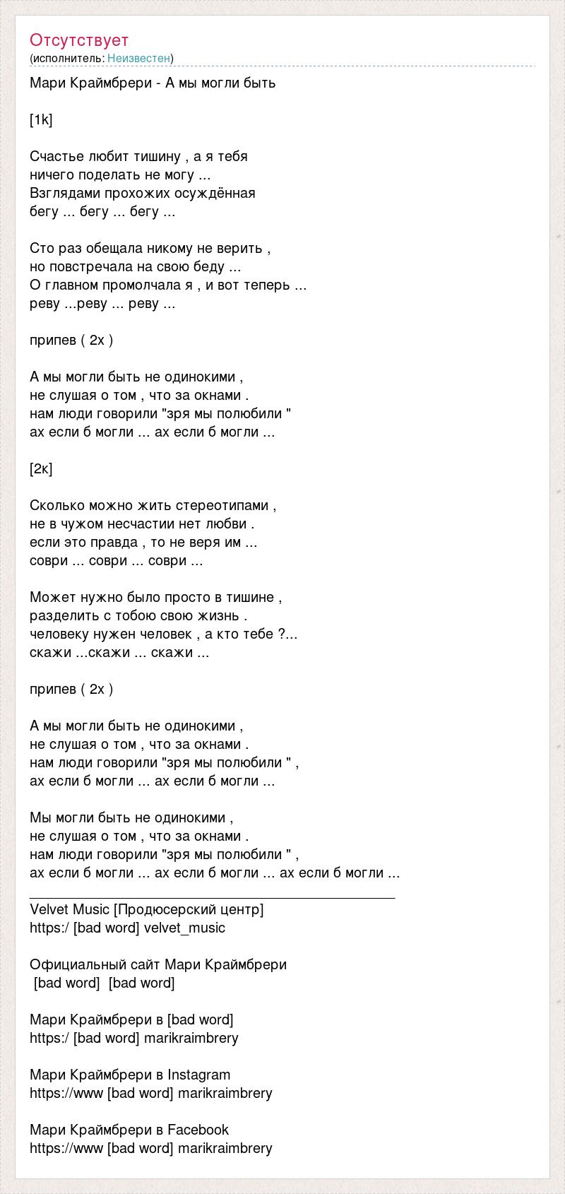 Мари Краймбрери - А мы могли быть [1k] Счастье любит тишину , а я тебя ничего поделать не могу ... Взглядами прохожих осуждённая бегу ... бегу ... бегу ... Сто раз обещала никому не верить , но повстречала на свою беду ... О главном промолчала я , и вот теперь ... реву ...реву ... реву ... припев ( 2х ) А мы могли быть не одинокими , не слушая о том , что за окнами . нам люди говорили "зря мы полюбили " ах если б могли ... ах если б могли ... [2к] Сколько можно жить стереотипами , не в чужом несчастии нет любви . если это правда , то не веря им ... соври ... соври ... соври ... Может нужно было просто в тишине , разделить с тобою свою жизнь . человеку нужен человек , а кто тебе ?... скажи ...скажи ... скажи ... припев ( 2х ) А мы могли быть не одинокими , не слушая о том , что за окнами . нам люди говорили "зря мы полюбили " , ах если б могли ... ах если б могли ... Мы могли быть не одинокими , не слушая о том , что за окнами . нам люди говорили "зря мы полюбили " , ах если б могли ... ах если б могли ... ах если б могли ... _______________________________________________ Velvet Music [Продюсерский центр] https:/ [bad word] velvet_music Официальный сайт Мари Краймбрери [bad word] [bad word] Мари Краймбрери в [bad word] https:/ [bad word] marikraimbrery Мари Краймбрери в Instagram https://www [bad word] marikraimbrery Мари Краймбрери в Facebook https://www [bad word] marikraimbrery