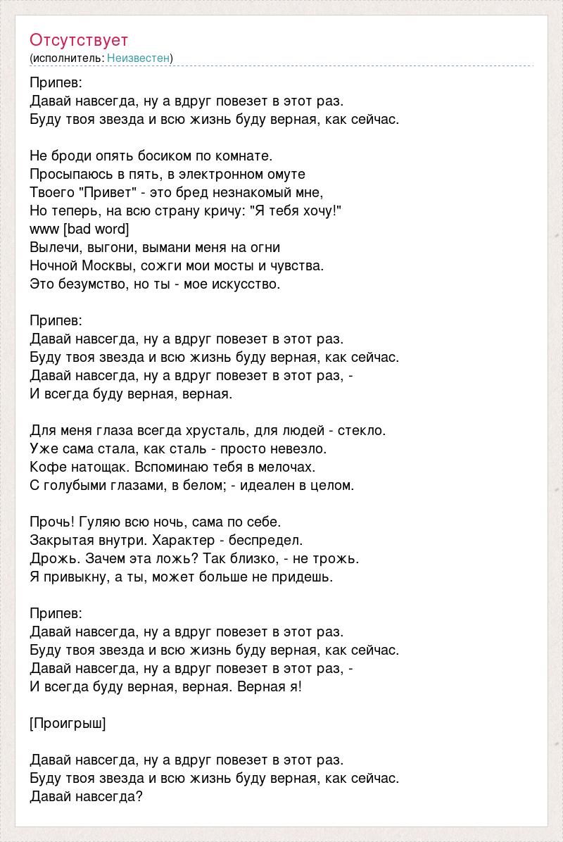 Припев: Давай навсегда, ну а вдруг повезет в этот раз. Буду твоя звезда и всю жизнь буду верная, как сейчас. Не броди опять босиком по комнате. Просыпаюсь в пять, в электронном омуте Твоего "Привет" - это бред незнакомый мне, Но теперь, на всю страну кричу: "Я тебя хочу!" www [bad word] Вылечи, выгони, вымани меня на огни Ночной Москвы, сожги мои мосты и чувства. Это безумство, но ты - мое искусство. Припев: Давай навсегда, ну а вдруг повезет в этот раз. Буду твоя звезда и всю жизнь буду верная, как сейчас. Давай навсегда, ну а вдруг повезет в этот раз, - И всегда буду верная, верная. Для меня глаза всегда хрусталь, для людей - стекло. Уже сама стала, как сталь - просто невезло. Кофе натощак. Вспоминаю тебя в мелочах. С голубыми глазами, в белом; - идеален в целом. Прочь! Гуляю всю ночь, сама по себе. Закрытая внутри. Характер - беспредел. Дрожь. Зачем эта ложь? Так близко, - не трожь. Я привыкну, а ты, может больше не придешь. Припев: Давай навсегда, ну а вдруг повезет в этот раз. Буду твоя звезда и всю жизнь буду верная, как сейчас. Давай навсегда, ну а вдруг повезет в этот раз, - И всегда буду верная, верная. Верная я! [Проигрыш] Давай навсегда, ну а вдруг повезет в этот раз. Буду твоя звезда и всю жизнь буду верная, как сейчас. Давай навсегда?