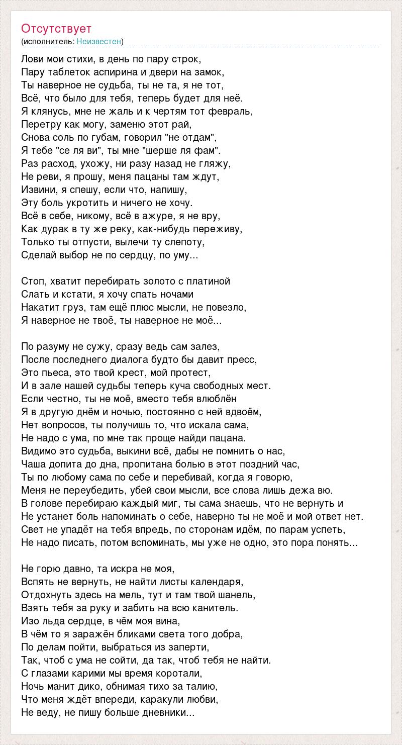Лови мои стихи, в день по пару строк, Пару таблеток аспирина и двери на замок, Ты наверное не судьба, ты не та, я не тот, Всё, что было для тебя, теперь будет для неё. Я клянусь, мне не жаль и к чертям тот февраль, Перетру как могу, заменю этот рай, Снова соль по губам, говорил "не отдам", Я тебе "се ля ви", ты мне "шерше ля фам". Раз расход, ухожу, ни разу назад не гляжу, Не реви, я прошу, меня пацаны там ждут, Извини, я спешу, если что, напишу, Эту боль укротить и ничего не хочу. Всё в себе, никому, всё в ажуре, я не вру, Как дурак в ту же реку, как-нибудь переживу, Только ты отпусти, вылечи ту слепоту, Сделай выбор не по сердцу, по уму... Стоп, хватит перебирать золото с платиной Слать и кстати, я хочу спать ночами Накатит груз, там ещё плюс мысли, не повезло, Я наверное не твоё, ты наверное не моё... По разуму не сужу, сразу ведь сам залез, После последнего диалога будто бы давит пресс, Это пьеса, это твой крест, мой протест, И в зале нашей судьбы теперь куча свободных мест. Если честно, ты не моё, вместо тебя влюблён Я в другую днём и ночью, постоянно с ней вдвоём, Нет вопросов, ты получишь то, что искала сама, Не надо с ума, по мне так проще найди пацана. Видимо это судьба, выкини всё, дабы не помнить о нас, Чаша допита до дна, пропитана болью в этот поздний час, Ты по любому сама по себе и перебивай, когда я говорю, Меня не переубедить, убей свои мысли, все слова лишь дежа вю. В голове перебираю каждый миг, ты сама знаешь, что не вернуть и Не устанет боль напоминать о себе, наверно ты не моё и мой ответ нет. Свет не упадёт на тебя впредь, по сторонам идём, по парам успеть, Не надо писать, потом вспоминать, мы уже не одно, это пора понять... Не горю давно, та искра не моя, Вспять не вернуть, не найти листы календаря, Отдохнуть здесь на мель, тут и там твой шанель, Взять тебя за руку и забить на всю канитель. Изо льда сердце, в чём моя вина, В чём то я заражён бликами света того добра, По делам пойти, выбраться из заперти, Так, чтоб с ума не сойти, да так, чтоб тебя не найти. С глазами карими мы время коротали, Ночь манит дико, обнимая тихо за талию, Что меня ждёт впереди, каракули любви, Не веду, не пишу больше дневники...