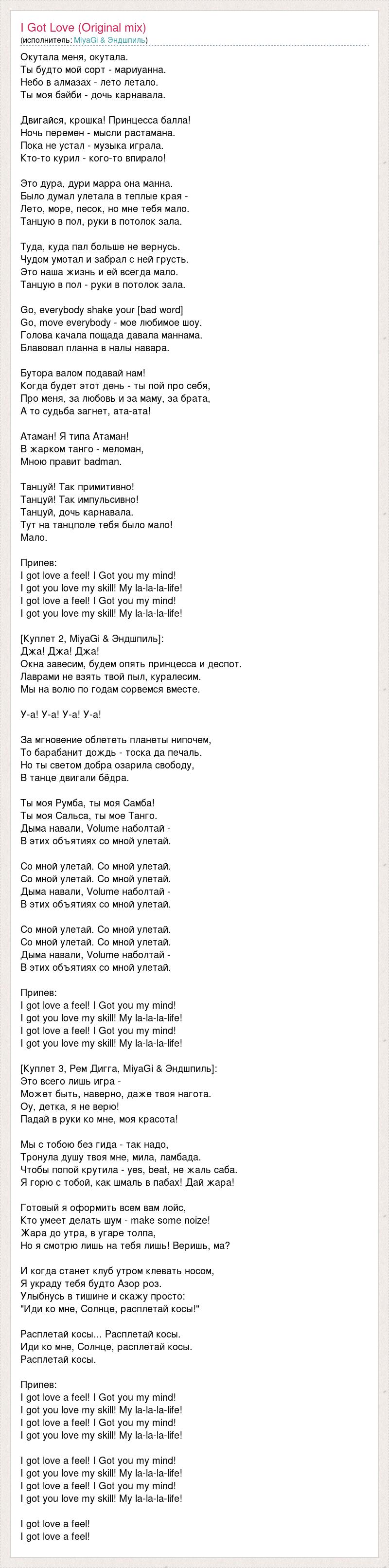 Окутала меня, окутала. Ты будто мой сорт - мариуанна. Небо в алмазах - лето летало. Ты моя бэйби - дочь карнавала. Двигайся, крошка! Принцесса балла! Ночь перемен - мысли растамана. Пока не устал - музыка играла. Кто-то курил - кого-то впирало! Это дура, дури марра она манна. Было думал улетала в теплые края - Лето, море, песок, но мне тебя мало. Танцую в пол, руки в потолок зала. Туда, куда пал больше не вернусь. Чудом умотал и забрал с ней грусть. Это наша жизнь и ей всегда мало. Танцую в пол - руки в потолок зала. Go, everybody shake your [bad word] Go, move everybody - мое любимое шоу. Голова качала пощада давала маннама. Блавовал планна в налы навара. Бутора валом подавай нам! Когда будет этот день - ты пой про себя, Про меня, за любовь и за маму, за брата, А то судьба загнет, ата-ата! Атаман! Я типа Атаман! В жарком танго - меломан, Мною правит badman. Танцуй! Так примитивно! Танцуй! Так импульсивно! Танцуй, дочь карнавала. Тут на танцполе тебя было мало! Мало. Припев: I got love a feel! I Got you my mind! I got you love my skill! My la-la-la-life! I got love a feel! I Got you my mind! I got you love my skill! My la-la-la-life! [Куплет 2, MiyaGi & Эндшпиль]: Джа! Джа! Джа! Окна завесим, будем опять принцесса и деспот. Лаврами не взять твой пыл, куралесим. Мы на волю по годам сорвемся вместе. У-а! У-а! У-а! У-а! За мгновение облететь планеты нипочем, То барабанит дождь - тоска да печаль. Но ты светом добра озарила свободу, В танце двигали бёдра. Ты моя Румба, ты моя Самба! Ты моя Сальса, ты мое Танго. Дыма навали, Volume наболтай - В этих объятиях со мной улетай. Со мной улетай. Со мной улетай. Со мной улетай. Со мной улетай. Дыма навали, Volume наболтай - В этих объятиях со мной улетай. Со мной улетай. Со мной улетай. Со мной улетай. Со мной улетай. Дыма навали, Volume наболтай - В этих объятиях со мной улетай. Припев: I got love a feel! I Got you my mind! I got you love my skill! My la-la-la-life! I got love a feel! I Got you my mind! I got you love my skill! My la-la-la-life! [Куплет 3, Рем Дигга, MiyaGi & Эндшпиль]: Это всего лишь игра - Может быть, наверно, даже твоя нагота. Оу, детка, я не верю! Падай в руки ко мне, моя красота! Мы с тобою без гида - так надо, Тронула душу твоя мне, мила, ламбада. Чтобы попой крутила - yes, beat, не жаль саба. Я горю с тобой, как шмаль в пабах! Дай жара! Готовый я оформить всем вам лойс, Кто умеет делать шум - make some noize! Жара до утра, в угаре толпа, Но я смотрю лишь на тебя лишь! Веришь, ма? И когда станет клуб утром клевать носом, Я украду тебя будто Азор роз. Улыбнусь в тишине и скажу просто: "Иди ко мне, Солнце, расплетай косы!" Расплетай косы... Расплетай косы. Иди ко мне, Солнце, расплетай косы. Расплетай косы. Припев: I got love a feel! I Got you my mind! I got you love my skill! My la-la-la-life! I got love a feel! I Got you my mind! I got you love my skill! My la-la-la-life! I got love a feel! I Got you my mind! I got you love my skill! My la-la-la-life! I got love a feel! I Got you my mind! I got you love my skill! My la-la-la-life! I got love a feel! I got love a feel!