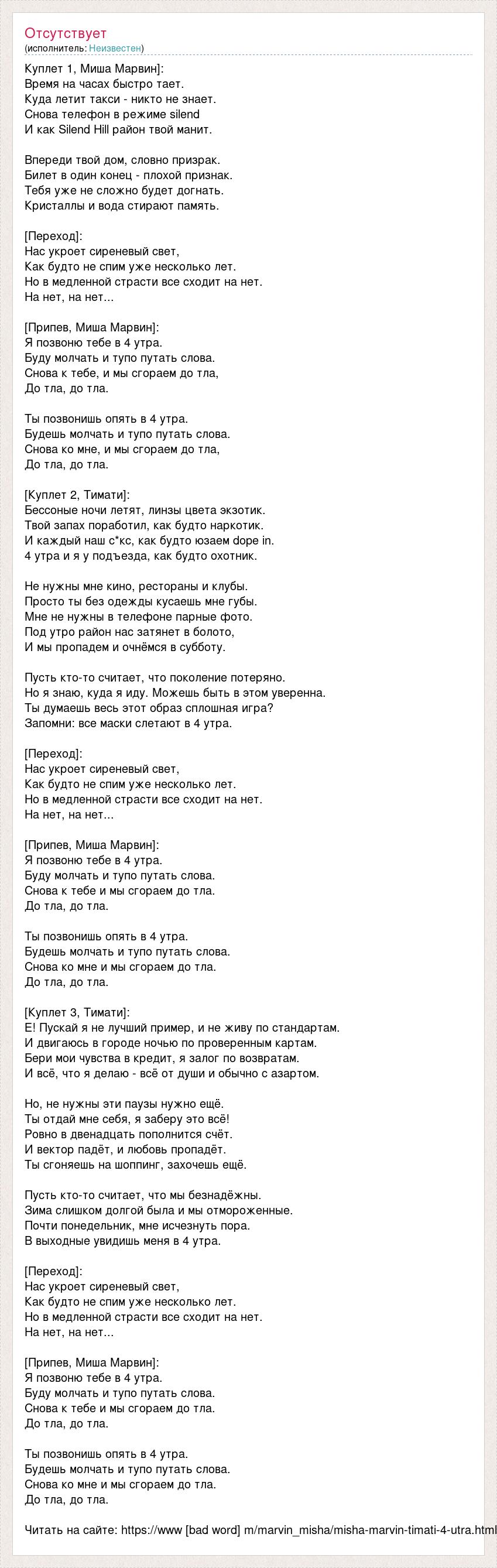 Куплет 1, Миша Марвин]: Время на часах быстро тает. Куда летит такси - никто не знает. Снова телефон в режиме silend И как Silend Hill район твой манит. Впереди твой дом, словно призрак. Билет в один конец - плохой признак. Тебя уже не сложно будет догнать. Кристаллы и вода стирают память. [Переход]: Нас укроет сиреневый свет, Как будто не спим уже несколько лет. Но в медленной страсти все сходит на нет. На нет, на нет... [Припев, Миша Марвин]: Я позвоню тебе в 4 утра. Буду молчать и тупо путать слова. Снова к тебе, и мы сгораем до тла, До тла, до тла. Ты позвонишь опять в 4 утра. Будешь молчать и тупо путать слова. Снова ко мне, и мы сгораем до тла, До тла, до тла. [Куплет 2, Тимати]: Бессоные ночи летят, линзы цвета экзотик. Твой запах поработил, как будто наркотик. И каждый наш с*кс, как будто юзаем dope in. 4 утра и я у подъезда, как будто охотник. Не нужны мне кино, рестораны и клубы. Просто ты без одежды кусаешь мне губы. Мне не нужны в телефоне парные фото. Под утро район нас затянет в болото, И мы пропадем и очнёмся в субботу. Пусть кто-то считает, что поколение потеряно. Но я знаю, куда я иду. Можешь быть в этом уверенна. Ты думаешь весь этот образ сплошная игра? Запомни: все маски слетают в 4 утра. [Переход]: Нас укроет сиреневый свет, Как будто не спим уже несколько лет. Но в медленной страсти все сходит на нет. На нет, на нет... [Припев, Миша Марвин]: Я позвоню тебе в 4 утра. Буду молчать и тупо путать слова. Снова к тебе и мы сгораем до тла. До тла, до тла. Ты позвонишь опять в 4 утра. Будешь молчать и тупо путать слова. Снова ко мне и мы сгораем до тла. До тла, до тла. [Куплет 3, Тимати]: Е! Пускай я не лучший пример, и не живу по стандартам. И двигаюсь в городе ночью по проверенным картам. Бери мои чувства в кредит, я залог по возвратам. И всё, что я делаю - всё от души и обычно с азартом. Но, не нужны эти паузы нужно ещё. Ты отдай мне себя, я заберу это всё! Ровно в двенадцать пополнится счёт. И вектор падёт, и любовь пропадёт. Ты сгоняешь на шоппинг, захочешь ещё. Пусть кто-то считает, что мы безнадёжны. Зима слишком долгой была и мы отмороженные. Почти понедельник, мне исчезнуть пора. В выходные увидишь меня в 4 утра. [Переход]: Нас укроет сиреневый свет, Как будто не спим уже несколько лет. Но в медленной страсти все сходит на нет. На нет, на нет... [Припев, Миша Марвин]: Я позвоню тебе в 4 утра. Буду молчать и тупо путать слова. Снова к тебе и мы сгораем до тла. До тла, до тла. Ты позвонишь опять в 4 утра. Будешь молчать и тупо путать слова. Снова ко мне и мы сгораем до тла. До тла, до тла. Читать на сайте: https://www [bad word] m/marvin_misha/misha-marvin-timati-4-utra.html