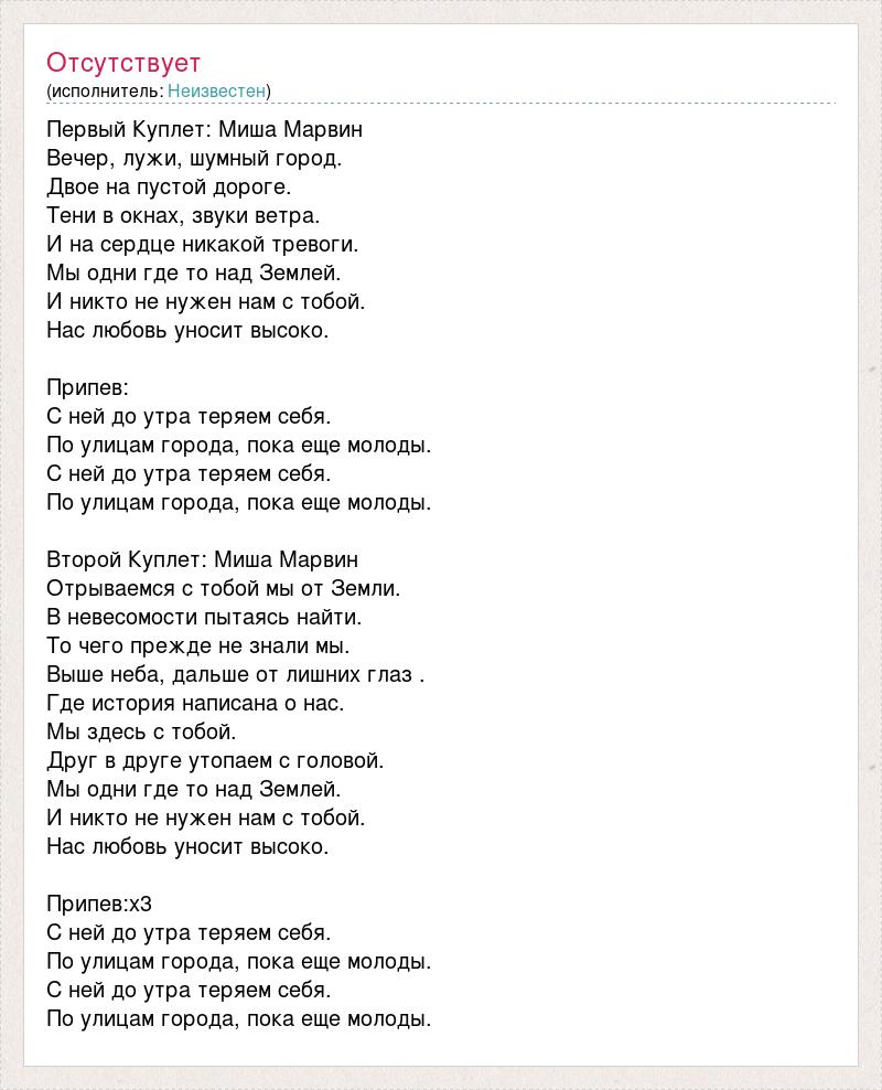 Первый Куплет: Миша Марвин Вечер, лужи, шумный город. Двое на пустой дороге. Тени в окнах, звуки ветра. И на сердце никакой тревоги. Мы одни где то над Землей. И никто не нужен нам с тобой. Нас любовь уносит высоко. Припев: С ней до утра теряем себя. По улицам города, пока еще молоды. С ней до утра теряем себя. По улицам города, пока еще молоды. Второй Куплет: Миша Марвин Отрываемся с тобой мы от Земли. В невесомости пытаясь найти. То чего прежде не знали мы. Выше неба, дальше от лишних глаз . Где история написана о нас. Мы здесь с тобой. Друг в друге утопаем с головой. Мы одни где то над Землей. И никто не нужен нам с тобой. Нас любовь уносит высоко. Припев:х3 С ней до утра теряем себя. По улицам города, пока еще молоды. С ней до утра теряем себя. По улицам города, пока еще молоды.