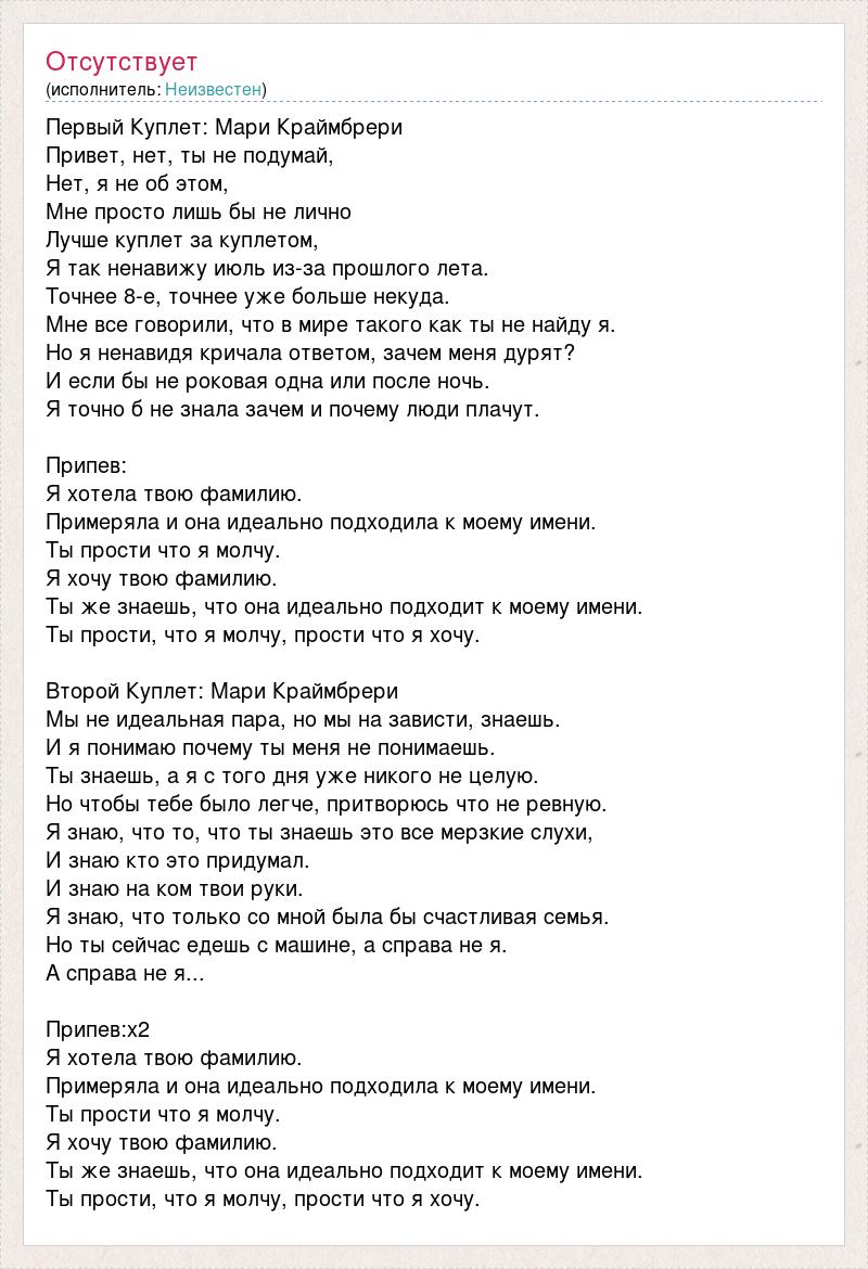 Первый Куплет: Мари Краймбрери Привет, нет, ты не подумай, Нет, я не об этом, Мне просто лишь бы не лично Лучше куплет за куплетом, Я так ненавижу июль из-за прошлого лета. Точнее 8-е, точнее уже больше некуда. Мне все говорили, что в мире такого как ты не найду я. Но я ненавидя кричала ответом, зачем меня дурят? И если бы не роковая одна или после ночь. Я точно б не знала зачем и почему люди плачут. Припев: Я хотела твою фамилию. Примеряла и она идеально подходила к моему имени. Ты прости что я молчу. Я хочу твою фамилию. Ты же знаешь, что она идеально подходит к моему имени. Ты прости, что я молчу, прости что я хочу. Второй Куплет: Мари Краймбрери Мы не идеальная пара, но мы на зависти, знаешь. И я понимаю почему ты меня не понимаешь. Ты знаешь, а я с того дня уже никого не целую. Но чтобы тебе было легче, притворюсь что не ревную. Я знаю, что то, что ты знаешь это все мерзкие слухи, И знаю кто это придумал. И знаю на ком твои руки. Я знаю, что только со мной была бы счастливая семья. Но ты сейчас едешь с машине, а справа не я. А справа не я... Припев:х2 Я хотела твою фамилию. Примеряла и она идеально подходила к моему имени. Ты прости что я молчу. Я хочу твою фамилию. Ты же знаешь, что она идеально подходит к моему имени. Ты прости, что я молчу, прости что я хочу.