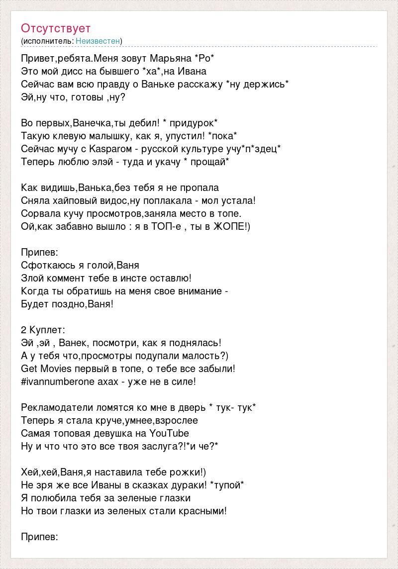 Привет,ребята.Меня зовут Марьяна *Ро* Это мой дисс на бывшего *ха*,на Ивана Сейчас вам всю правду о Ваньке расскажу *ну держись* Эй,ну что, готовы ,ну? Во первых,Ванечка,ты дебил! * придурок* Такую клевую малышку, как я, упустил! *пока* Сейчас мучу с Kasparом - русской культуре учу*п*здец* Теперь люблю элэй - туда и укачу * прощай* Как видишь,Ванька,без тебя я не пропала Сняла хайповый видос,ну поплакала - мол устала! Сорвала кучу просмотров,заняла место в топе. Ой,как забавно вышло : я в ТОП-е , ты в ЖОПЕ!) Припев: Сфоткаюсь я голой,Ваня Злой коммент тебе в инсте оставлю! Когда ты обратишь на меня свое внимание - Будет поздно,Ваня! 2 Куплет: Эй ,эй , Ванек, посмотри, как я поднялась! А у тебя что,просмотры подупали малость?) Get Movies первый в топе, о тебе все забыли! #ivannumberone ахах - уже не в силе! Рекламодатели ломятся ко мне в дверь * тук- тук* Теперь я стала круче,умнее,взрослее Самая топовая девушка на YouTube Ну и что что это все твоя заслуга?!*и че?* Хей,хей,Ваня,я наставила тебе рожки!) Не зря же все Иваны в сказках дураки! *тупой* Я полюбила тебя за зеленые глазки Но твои глазки из зеленых стали красными! Припев: