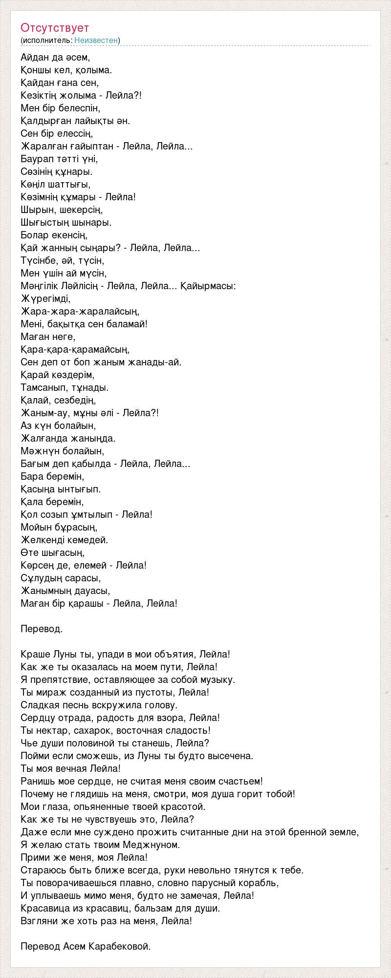 Айдан да әсем, Қоншы кел, қолыма. Қайдан ғана сен, Кезіктің жолыма - Лейла?! Мен бір белеспін, Қалдырған лайықты ән. Сен бір елессің, Жаралған ғайыптан - Лейла, Лейла... Баурап тәтті үні, Сөзінің құнары. Көңіл шаттығы, Көзімнің құмары - Лейла! Шырын, шекерсің, Шығыстың шынары. Болар екенсің, Қай жанның сыңары? - Лейла, Лейла... Түсінбе, әй, түсін, Мен үшін ай мүсін, Мәңгілік Ләйлісің - Лейла, Лейла... Қайырмасы: Жүрегімді, Жара-жара-жаралайсың, Мені, бақытқа сен баламай! Маған неге, Қара-қара-қарамайсың, Сен деп от боп жаным жанады-ай. Қарай көздерім, Тамсанып, тұнады. Қалай, сезбедің, Жаным-ау, мұны әлі - Лейла?! Аз күн болайын, Жалғанда жаныңда. Мәжнүн болайын, Бағым деп қабылда - Лейла, Лейла... Бара беремін, Қасыңа ынтығып. Қала беремін, Қол созып ұмтылып - Лейла! Мойын бұрасың, Желкенді кемедей. Өте шығасың, Көрсең де, елемей - Лейла! Сұлудың сарасы, Жанымның дауасы, Маған бір қарашы - Лейла, Лейла! Перевод. Краше Луны ты, упади в мои объятия, Лейла! Как же ты оказалась на моем пути, Лейла! Я препятствие, оставляющее за собой музыку. Ты мираж созданный из пустоты, Лейла! Сладкая песнь вскружила голову. Сердцу отрада, радость для взора, Лейла! Ты нектар, сахарок, восточная сладость! Чье души половиной ты станешь, Лейла? Пойми если сможешь, из Луны ты будто высечена. Ты моя вечная Лейла! Ранишь мое сердце, не считая меня своим счастьем! Почему не глядишь на меня, смотри, моя душа горит тобой! Мои глаза, опьяненные твоей красотой. Как же ты не чувствуешь это, Лейла? Даже если мне суждено прожить считанные дни на этой бренной земле, Я желаю стать твоим Меджнуном. Прими же меня, моя Лейла! Стараюсь быть ближе всегда, руки невольно тянутся к тебе. Ты поворачиваешься плавно, словно парусный корабль, И уплываешь мимо меня, будто не замечая, Лейла! Красавица из красавиц, бальзам для души. Взгляни же хоть раз на меня, Лейла! Перевод Асем Карабековой.