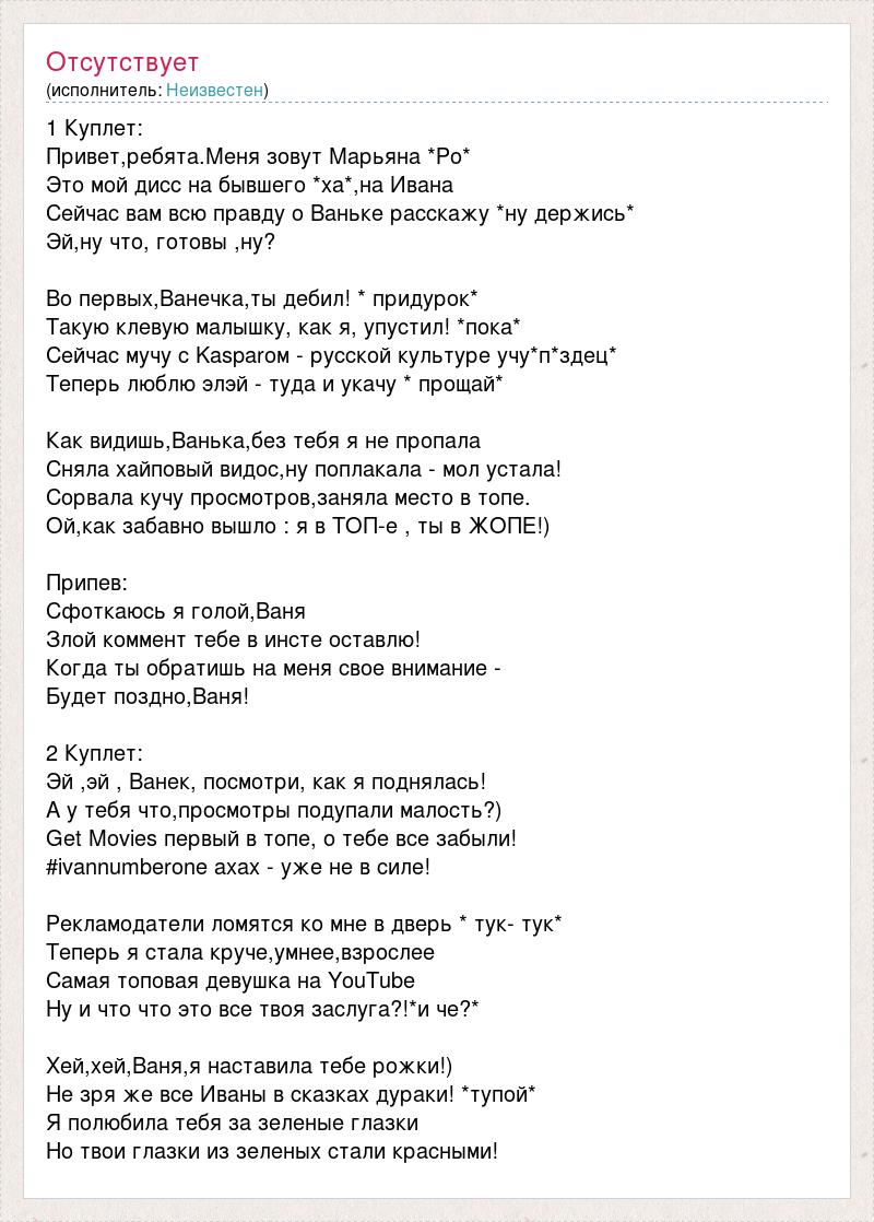 1 Куплет: Привет,ребята.Меня зовут Марьяна *Ро* Это мой дисс на бывшего *ха*,на Ивана Сейчас вам всю правду о Ваньке расскажу *ну держись* Эй,ну что, готовы ,ну? Во первых,Ванечка,ты дебил! * придурок* Такую клевую малышку, как я, упустил! *пока* Сейчас мучу с Kasparом - русской культуре учу*п*здец* Теперь люблю элэй - туда и укачу * прощай* Как видишь,Ванька,без тебя я не пропала Сняла хайповый видос,ну поплакала - мол устала! Сорвала кучу просмотров,заняла место в топе. Ой,как забавно вышло : я в ТОП-е , ты в ЖОПЕ!) Припев: Сфоткаюсь я голой,Ваня Злой коммент тебе в инсте оставлю! Когда ты обратишь на меня свое внимание - Будет поздно,Ваня! 2 Куплет: Эй ,эй , Ванек, посмотри, как я поднялась! А у тебя что,просмотры подупали малость?) Get Movies первый в топе, о тебе все забыли! #ivannumberone ахах - уже не в силе! Рекламодатели ломятся ко мне в дверь * тук- тук* Теперь я стала круче,умнее,взрослее Самая топовая девушка на YouTube Ну и что что это все твоя заслуга?!*и че?* Хей,хей,Ваня,я наставила тебе рожки!) Не зря же все Иваны в сказках дураки! *тупой* Я полюбила тебя за зеленые глазки Но твои глазки из зеленых стали красными!