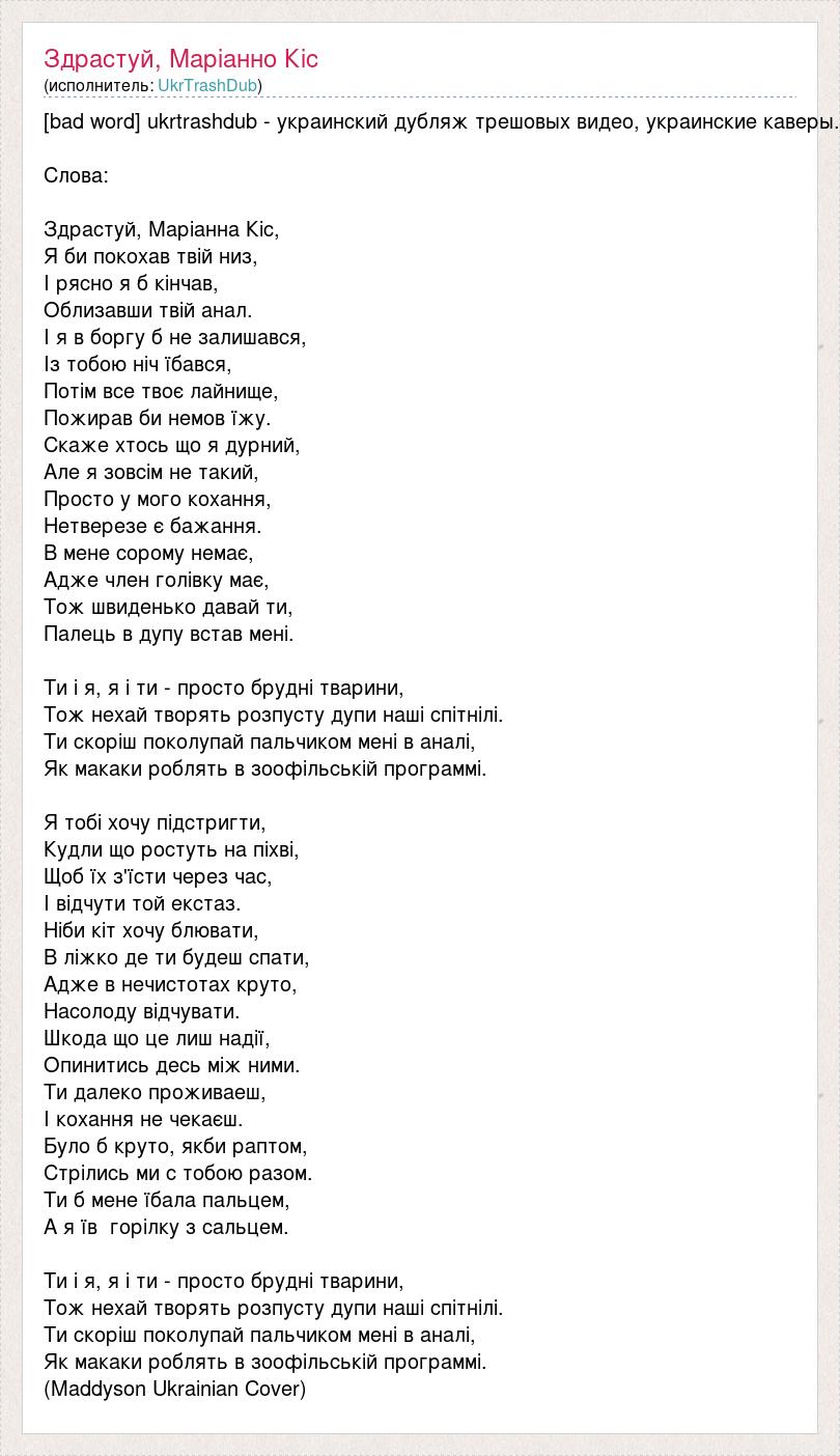 [bad word] ukrtrashdub - украинский дубляж трешовых видео, украинские каверы. Слова: Здрастуй, Маріанна Кіс, Я би покохав твій низ, І рясно я б кінчав, Облизавши твій анал. І я в боргу б не залишався, Із тобою ніч їбався, Потім все твоє лайнище, Пожирав би немов їжу. Скаже хтось що я дурний, Але я зовсім не такий, Просто у мого кохання, Нетверезе є бажання. В мене сорому немає, Адже член голівку має, Тож швиденько давай ти, Палець в дупу встав мені. Ти і я, я і ти - просто брудні тварини, Тож нехай творять розпусту дупи наші спітнілі. Ти скоріш поколупай пальчиком мені в аналі, Як макаки роблять в зоофільській программі. Я тобі хочу підстригти, Кудли що ростуть на піхві, Щоб їх з'їсти через час, І відчути той екстаз. Ніби кіт хочу блювати, В ліжко де ти будеш спати, Адже в нечистотах круто, Насолоду відчувати. Шкода що це лиш надії, Опинитись десь між ними. Ти далеко проживаеш, І кохання не чекаєш. Було б круто, якби раптом, Стрілись ми с тобою разом. Ти б мене їбала пальцем, А я їв горілку з сальцем. Ти і я, я і ти - просто брудні тварини, Тож нехай творять розпусту дупи наші спітнілі. Ти скоріш поколупай пальчиком мені в аналі, Як макаки роблять в зоофільській программі. (Maddyson Ukrainian Cover)