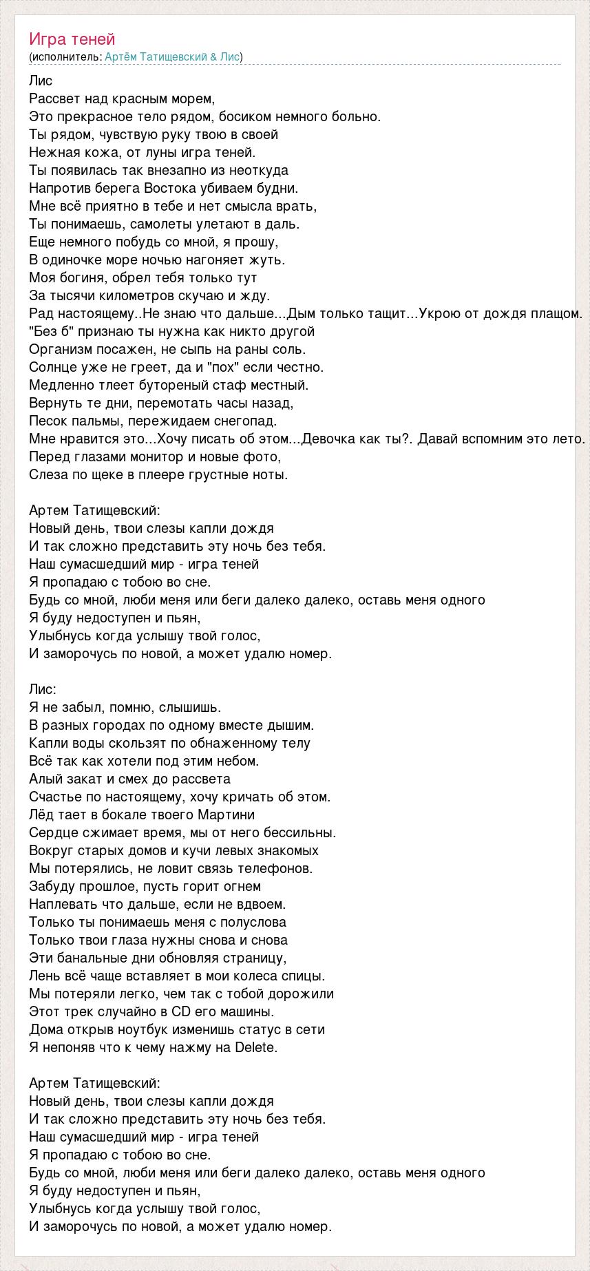 Лис Рассвет над красным морем, Это прекрасное тело рядом, босиком немного больно. Ты рядом, чувствую руку твою в своей Нежная кожа, от луны игра теней. Ты появилась так внезапно из неоткуда Напротив берега Востока убиваем будни. Мне всё приятно в тебе и нет смысла врать, Ты понимаешь, самолеты улетают в даль. Еще немного побудь со мной, я прошу, В одиночке море ночью нагоняет жуть. Моя богиня, обрел тебя только тут За тысячи километров скучаю и жду. Рад настоящему..Не знаю что дальше...Дым только тащит...Укрою от дождя плащом. "Без б" признаю ты нужна как никто другой Организм посажен, не сыпь на раны соль. Солнце уже не греет, да и "пох" если честно. Медленно тлеет бутореный стаф местный. Вернуть те дни, перемотать часы назад, Песок пальмы, пережидаем снегопад. Мне нравится это...Хочу писать об этом...Девочка как ты?. Давай вспомним это лето. Перед глазами монитор и новые фото, Слеза по щеке в плеере грустные ноты. Артем Татищевский: Новый день, твои слезы капли дождя И так сложно представить эту ночь без тебя. Наш сумасшедший мир - игра теней Я пропадаю с тобою во сне. Будь со мной, люби меня или беги далеко далеко, оставь меня одного Я буду недоступен и пьян, Улыбнусь когда услышу твой голос, И заморочусь по новой, а может удалю номер. Лис: Я не забыл, помню, слышишь. В разных городах по одному вместе дышим. Капли воды скользят по обнаженному телу Всё так как хотели под этим небом. Алый закат и смех до рассвета Счастье по настоящему, хочу кричать об этом. Лёд тает в бокале твоего Мартини Сердце сжимает время, мы от него бессильны. Вокруг старых домов и кучи левых знакомых Мы потерялись, не ловит связь телефонов. Забуду прошлое, пусть горит огнем Наплевать что дальше, если не вдвоем. Только ты понимаешь меня с полуслова Только твои глаза нужны снова и снова Эти банальные дни обновляя страницу, Лень всё чаще вставляет в мои колеса спицы. Мы потеряли легко, чем так с тобой дорожили Этот трек случайно в CD его машины. Дома открыв ноутбук изменишь статус в сети Я непоняв что к чему нажму на Delete. Артем Татищевский: Новый день, твои слезы капли дождя И так сложно представить эту ночь без тебя. Наш сумасшедший мир - игра теней Я пропадаю с тобою во сне. Будь со мной, люби меня или беги далеко далеко, оставь меня одного Я буду недоступен и пьян, Улыбнусь когда услышу твой голос, И заморочусь по новой, а может удалю номер.