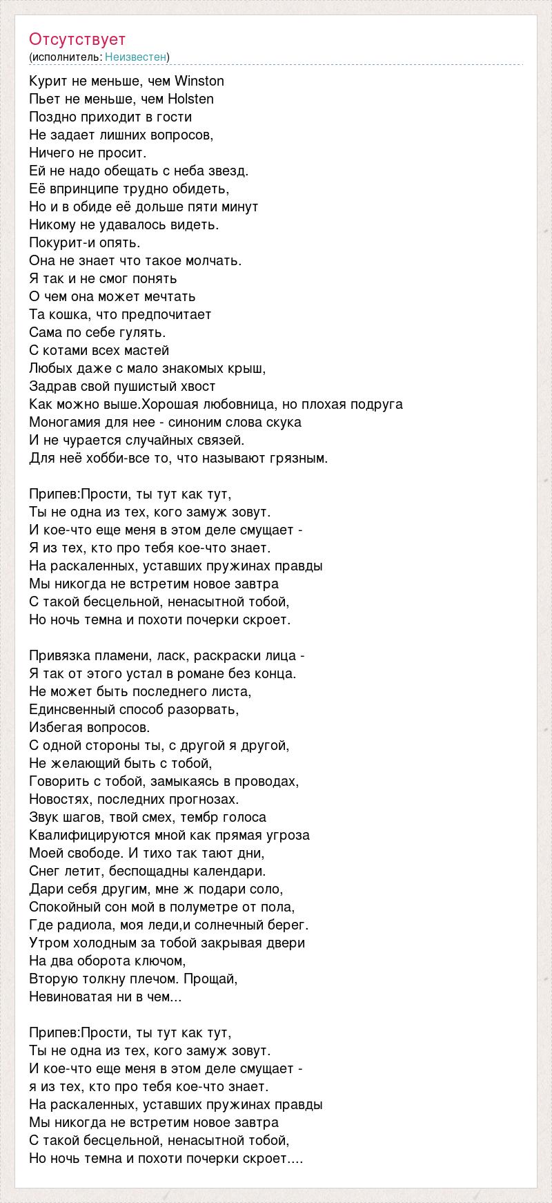 Курит не меньше, чем Winston Пьет не меньше, чем Holsten Поздно приходит в гости Не задает лишних вопросов, Ничего не просит. Ей не надо обещать с неба звезд. Её впринципе трудно обидеть, Но и в обиде её дольше пяти минут Никому не удавалось видеть. Покурит-и опять. Она не знает что такое молчать. Я так и не смог понять О чем она может мечтать Та кошка, что предпочитает Сама по себе гулять. С котами всех мастей Любых даже с мало знакомых крыш, Задрав свой пушистый хвост Как можно выше.Хорошая любовница, но плохая подруга Моногамия для нее - синоним слова скука И не чурается случайных связей. Для неё хобби-все то, что называют грязным. Припев:Прости, ты тут как тут, Ты не одна из тех, кого замуж зовут. И кое-что еще меня в этом деле смущает - Я из тех, кто про тебя кое-что знает. На раскаленных, уставших пружинах правды Мы никогда не встретим новое завтра С такой бесцельной, ненасытной тобой, Но ночь темна и похоти почерки скроет. Привязка пламени, ласк, раскраски лица - Я так от этого устал в романе без конца. Не может быть последнего листа, Единсвенный способ разорвать, Избегая вопросов. С одной стороны ты, с другой я другой, Не желающий быть с тобой, Говорить с тобой, замыкаясь в проводах, Новостях, последних прогнозах. Звук шагов, твой смех, тембр голоса Квалифицируются мной как прямая угроза Моей свободе. И тихо так тают дни, Снег летит, беспощадны календари. Дари себя другим, мне ж подари соло, Спокойный сон мой в полуметре от пола, Где радиола, моя леди,и солнечный берег. Утром холодным за тобой закрывая двери На два оборота ключом, Вторую толкну плечом. Прощай, Невиноватая ни в чем... Припев:Прости, ты тут как тут, Ты не одна из тех, кого замуж зовут. И кое-что еще меня в этом деле смущает - я из тех, кто про тебя кое-что знает. На раскаленных, уставших пружинах правды Мы никогда не встретим новое завтра С такой бесцельной, ненасытной тобой, Но ночь темна и похоти почерки скроет....