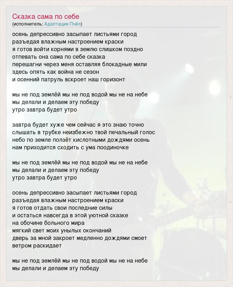 осень депрессивно засыпает листьями город разъедая влажным настроением краски я готов войти корнями в землю слишком поздно отпевать она сама по себе сказка перешагни через меня оставляя блокадные мили здесь опять как война не сезон и осенний патруль вскроет наш горизонт мы не под землёй мы не под водой мы не на небе мы делали и делаем эту победу утро завтра будет утро завтра будет хуже чем сейчас я это знаю точно слышать в трубке неизбежно твой печальный голос небо по земле ползёт кислотными дождями осень нам приходится сходить с ума поодиночке мы не под землёй мы не под водой мы не на небе мы делали и делаем эту победу утро завтра будет утро осень депрессивно засыпает листьями город разъедая влажным настроением краски я готов отдать свои последние силы и остаться навсегда в этой уютной сказке на обочине больного мира мягкий свет моих унылых окончаний дверь за мной закроет медленно дождями смоет ветром раскидает мы не под землёй мы не под водой мы не на небе мы делали и делаем эту победу