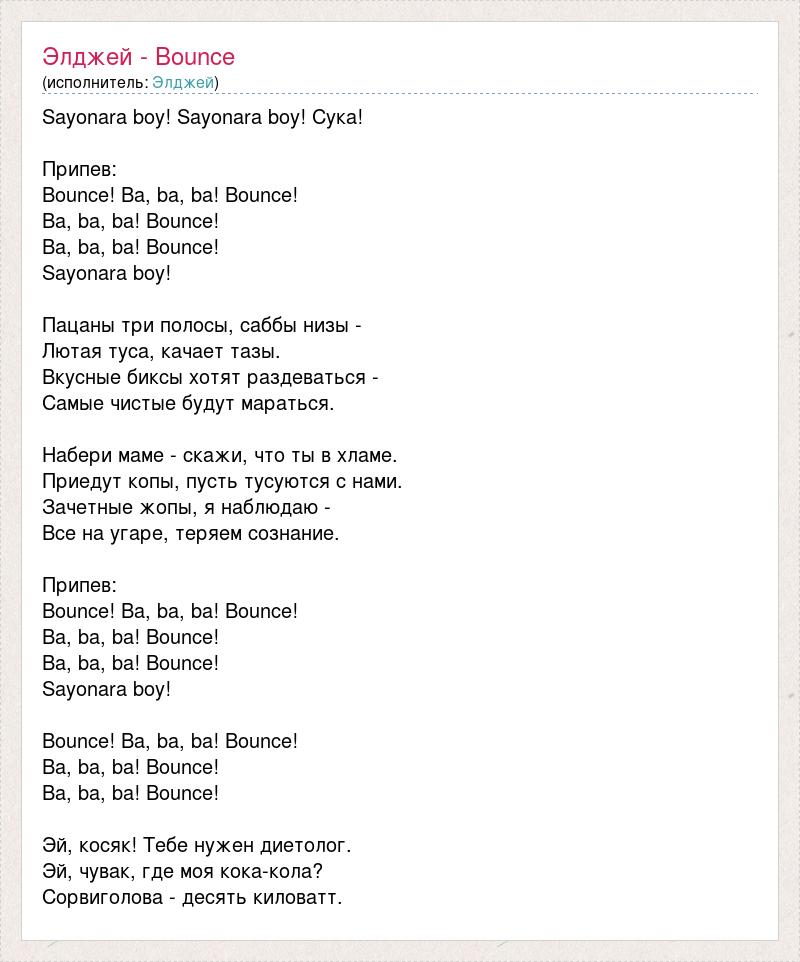 Sayonara boy! Sayonara boy! Сука! Припев: Bounce! Ba, ba, ba! Bounce! Ba, ba, ba! Bounce! Ba, ba, ba! Bounce! Sayonara boy! Пацаны три полосы, саббы низы - Лютая туса, качает тазы. Вкусные биксы хотят раздеваться - Самые чистые будут мараться. Набери маме - скажи, что ты в хламе. Приедут копы, пусть тусуются с нами. Зачетные жопы, я наблюдаю - Все на угаре, теряем сознание. Припев: Bounce! Ba, ba, ba! Bounce! Ba, ba, ba! Bounce! Ba, ba, ba! Bounce! Sayonara boy! Bounce! Ba, ba, ba! Bounce! Ba, ba, ba! Bounce! Ba, ba, ba! Bounce! Эй, косяк! Тебе нужен диетолог. Эй, чувак, где моя кока-кола? Сорвиголова - десять киловатт.