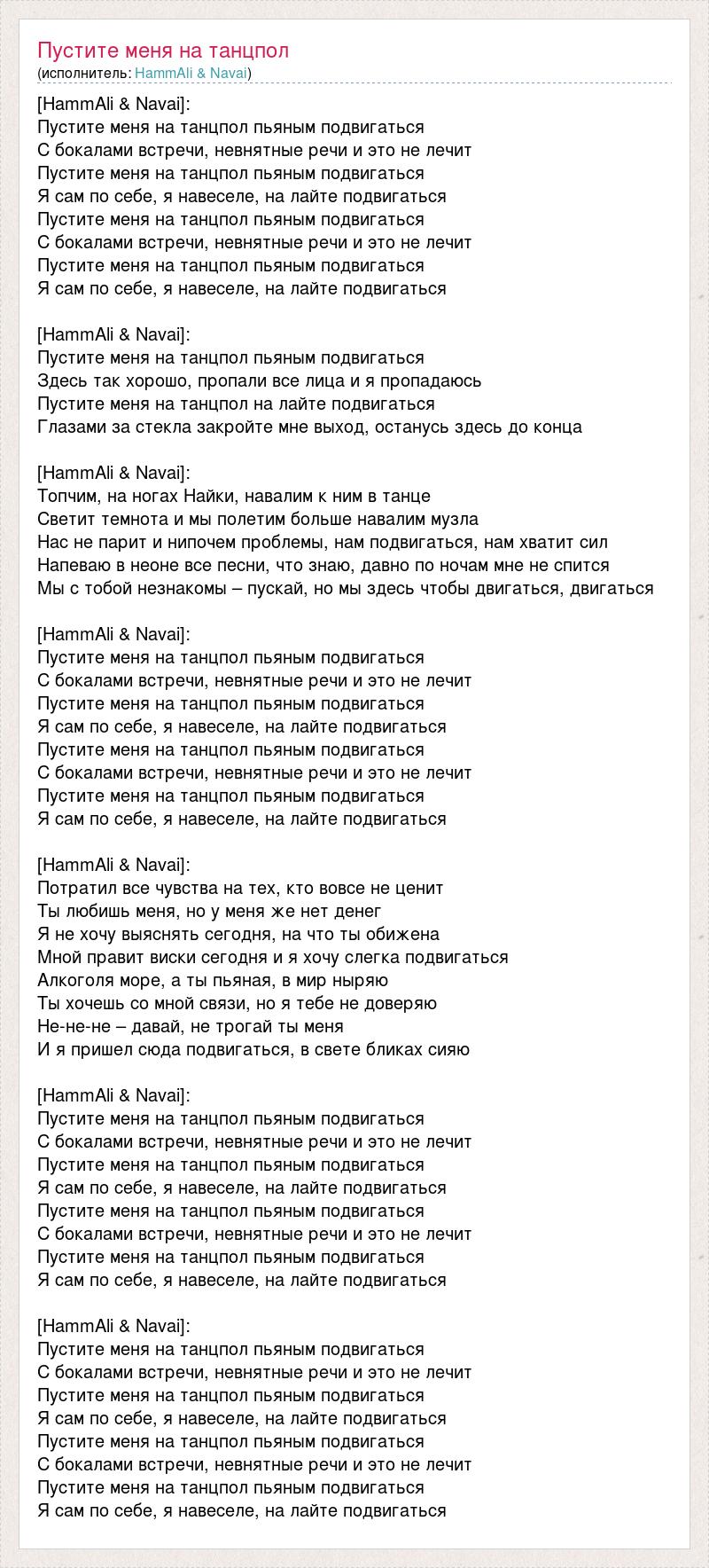 [HammAli & Navai]: Пустите меня на танцпол пьяным подвигаться С бокалами встречи, невнятные речи и это не лечит Пустите меня на танцпол пьяным подвигаться Я сам по себе, я навеселе, на лайте подвигаться Пустите меня на танцпол пьяным подвигаться С бокалами встречи, невнятные речи и это не лечит Пустите меня на танцпол пьяным подвигаться Я сам по себе, я навеселе, на лайте подвигаться [HammAli & Navai]: Пустите меня на танцпол пьяным подвигаться Здесь так хорошо, пропали все лица и я пропадаюсь Пустите меня на танцпол на лайте подвигаться Глазами за стекла закройте мне выход, останусь здесь до конца [HammAli & Navai]: Топчим, на ногах Найки, навалим к ним в танце Светит темнота и мы полетим больше навалим музла Нас не парит и нипочем проблемы, нам подвигаться, нам хватит сил Напеваю в неоне все песни, что знаю, давно по ночам мне не спится Мы с тобой незнакомы – пускай, но мы здесь чтобы двигаться, двигаться [HammAli & Navai]: Пустите меня на танцпол пьяным подвигаться С бокалами встречи, невнятные речи и это не лечит Пустите меня на танцпол пьяным подвигаться Я сам по себе, я навеселе, на лайте подвигаться Пустите меня на танцпол пьяным подвигаться С бокалами встречи, невнятные речи и это не лечит Пустите меня на танцпол пьяным подвигаться Я сам по себе, я навеселе, на лайте подвигаться [HammAli & Navai]: Потратил все чувства на тех, кто вовсе не ценит Ты любишь меня, но у меня же нет денег Я не хочу выяснять сегодня, на что ты обижена Мной правит виски сегодня и я хочу слегка подвигаться Алкоголя море, а ты пьяная, в мир ныряю Ты хочешь со мной связи, но я тебе не доверяю Не-не-не – давай, не трогай ты меня И я пришел сюда подвигаться, в свете бликах сияю [HammAli & Navai]: Пустите меня на танцпол пьяным подвигаться С бокалами встречи, невнятные речи и это не лечит Пустите меня на танцпол пьяным подвигаться Я сам по себе, я навеселе, на лайте подвигаться Пустите меня на танцпол пьяным подвигаться С бокалами встречи, невнятные речи и это не лечит Пустите меня на танцпол пьяным подвигаться Я сам по себе, я навеселе, на лайте подвигаться [HammAli & Navai]: Пустите меня на танцпол пьяным подвигаться С бокалами встречи, невнятные речи и это не лечит Пустите меня на танцпол пьяным подвигаться Я сам по себе, я навеселе, на лайте подвигаться Пустите меня на танцпол пьяным подвигаться С бокалами встречи, невнятные речи и это не лечит Пустите меня на танцпол пьяным подвигаться Я сам по себе, я навеселе, на лайте подвигаться