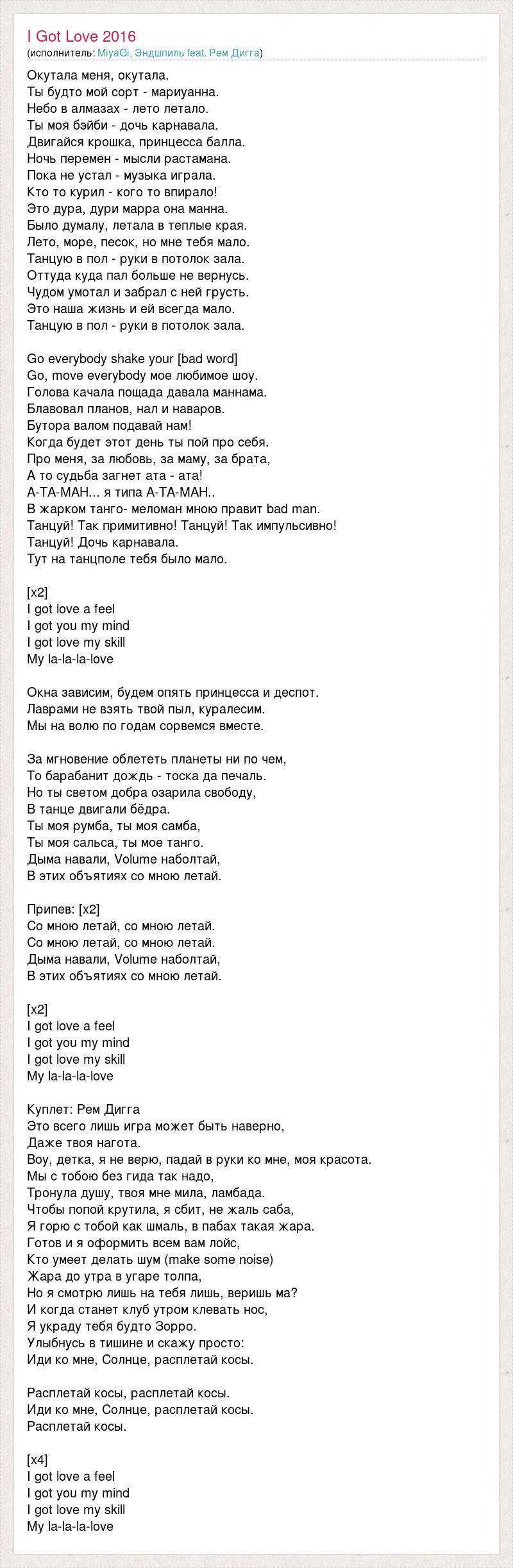 Окутала меня, окутала. Ты будто мой сорт - мариуанна. Небо в алмазах - лето летало. Ты моя бэйби - дочь карнавала. Двигайся крошка, принцесса балла. Ночь перемен - мысли растамана. Пока не устал - музыка играла. Кто то курил - кого то впирало! Это дура, дури марра она манна. Было думалу, летала в теплые края. Лето, море, песок, но мне тебя мало. Танцую в пол - руки в потолок зала. Оттуда куда пал больше не вернусь. Чудом умотал и забрал с ней грусть. Это наша жизнь и ей всегда мало. Танцую в пол - руки в потолок зала. Go everybody shake your [bad word] Go, move everybody мое любимое шоу. Голова качала пощада давала маннама. Блавовал планов, нал и наваров. Бутора валом подавай нам! Когда будет этот день ты пой про себя. Про меня, за любовь, за маму, за брата, А то судьба загнет ата - ата! А-ТА-МАН... я типа А-ТА-МАН.. В жарком танго- меломан мною правит bad man. Танцуй! Так примитивно! Танцуй! Так импульсивно! Танцуй! Дочь карнавала. Тут на танцполе тебя было мало. [x2] I got love a feel I got you my mind I got love my skill My la-la-la-love Окна зависим, будем опять принцесса и деспот. Лаврами не взять твой пыл, куралесим. Мы на волю по годам сорвемся вместе. За мгновение облететь планеты ни по чем, То барабанит дождь - тоска да печаль. Но ты светом добра озарила свободу, В танце двигали бёдра. Ты моя румба, ты моя самба, Ты моя сальса, ты мое танго. Дыма навали, Volume наболтай, В этих объятиях со мною летай. Припев: [х2] Со мною летай, со мною летай. Со мною летай, со мною летай. Дыма навали, Volume наболтай, В этих объятиях со мною летай. [х2] I got love a feel I got you my mind I got love my skill My la-la-la-love Куплет: Рем Дигга Это всего лишь игра может быть наверно, Даже твоя нагота. Воу, детка, я не верю, падай в руки ко мне, моя красота. Мы с тобою без гида так надо, Тронула душу, твоя мне мила, ламбада. Чтобы попой крутила, я сбит, не жаль саба, Я горю с тобой как шмаль, в пабах такая жара. Готов и я оформить всем вам лойс, Кто умеет делать шум (make some noise) Жара до утра в угаре толпа, Но я смотрю лишь на тебя лишь, веришь ма? И когда станет клуб утром клевать нос, Я украду тебя будто Зорро. Улыбнусь в тишине и скажу просто: Иди ко мне, Солнце, расплетай косы. Расплетай косы, расплетай косы. Иди ко мне, Солнце, расплетай косы. Расплетай косы. [x4] I got love a feel I got you my mind I got love my skill My la-la-la-love