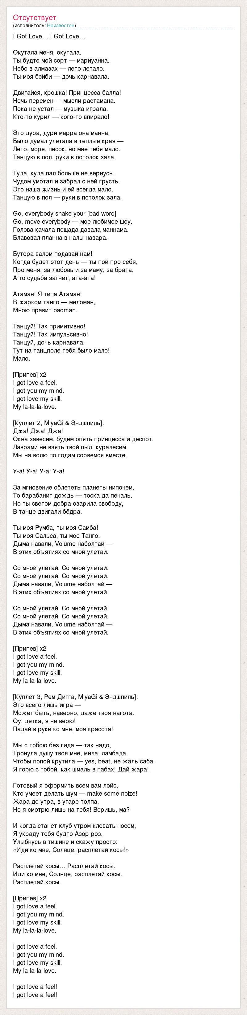 I Got Love… I Got Love… Окутала меня, окутала. Ты будто мой сорт — мариуанна. Небо в алмазах — лето летало. Ты моя бэйби — дочь карнавала. Двигайся, крошка! Принцесса балла! Ночь перемен — мысли растамана. Пока не устал — музыка играла. Кто-то курил — кого-то впирало! Это дура, дури марра она манна. Было думал улетала в теплые края — Лето, море, песок, но мне тебя мало. Танцую в пол, руки в потолок зала. Туда, куда пал больше не вернусь. Чудом умотал и забрал с ней грусть. Это наша жизнь и ей всегда мало. Танцую в пол — руки в потолок зала. Go, everybody shake your [bad word] Go, move everybody — мое любимое шоу. Голова качала пощада давала маннама. Блавовал планна в налы навара. Бутора валом подавай нам! Когда будет этот день — ты пой про себя, Про меня, за любовь и за маму, за брата, А то судьба загнет, ата-ата! Атаман! Я типа Атаман! В жарком танго — меломан, Мною правит badman. Танцуй! Так примитивно! Танцуй! Так импульсивно! Танцуй, дочь карнавала. Тут на танцполе тебя было мало! Мало. [Припев] x2 I got love а feel. I got you my mind. I got love my skill. My la-la-la-love. [Куплет 2, MiyaGi & Эндшпиль]: Джа! Джа! Джа! Окна завесим, будем опять принцесса и деспот. Лаврами не взять твой пыл, куралесим. Мы на волю по годам сорвемся вместе. У-а! У-а! У-а! У-а! За мгновение облететь планеты нипочем, То барабанит дождь — тоска да печаль. Но ты светом добра озарила свободу, В танце двигали бёдра. Ты моя Румба, ты моя Самба! Ты моя Сальса, ты мое Танго. Дыма навали, Volume наболтай — В этих объятиях со мной улетай. Со мной улетай. Со мной улетай. Со мной улетай. Со мной улетай. Дыма навали, Volume наболтай — В этих объятиях со мной улетай. Со мной улетай. Со мной улетай. Со мной улетай. Со мной улетай. Дыма навали, Volume наболтай — В этих объятиях со мной улетай. [Припев] x2 I got love а feel. I got you my mind. I got love my skill. My la-la-la-love. [Куплет 3, Рем Дигга, MiyaGi & Эндшпиль]: Это всего лишь игра — Может быть, наверно, даже твоя нагота. Оу, детка, я не верю! Падай в руки ко мне, моя красота! Мы с тобою без гида — так надо, Тронула душу твоя мне, мила, ламбада. Чтобы попой крутила — yes, beat, не жаль саба. Я горю с тобой, как шмаль в пабах! Дай жара! Готовый я оформить всем вам лойс, Кто умеет делать шум — make some noize! Жара до утра, в угаре толпа, Но я смотрю лишь на тебя! Веришь, ма? И когда станет клуб утром клевать носом, Я украду тебя будто Азор роз. Улыбнусь в тишине и скажу просто: «Иди ко мне, Солнце, расплетай косы!» Расплетай косы… Расплетай косы. Иди ко мне, Солнце, расплетай косы. Расплетай косы. [Припев] x2 I got love а feel. I got you my mind. I got love my skill. My la-la-la-love. I got love а feel. I got you my mind. I got love my skill. My la-la-la-love. I got love a feel! I got love a feel!