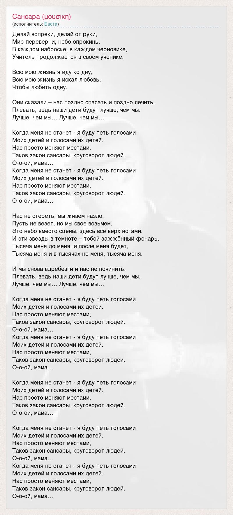 Делай вопреки, делай от руки, Мир переверни, небо опрокинь. В каждом наброске, в каждом черновике, Учитель продолжается в своем ученике. Всю мою жизнь я иду ко дну, Всю мою жизнь я искал любовь, Чтобы любить одну. Они сказали – нас поздно спасать и поздно лечить. Плевать, ведь наши дети будут лучше, чем мы. Лучше, чем мы… Лучше, чем мы… Когда меня не станет - я буду петь голосами Моих детей и голосами их детей. Нас просто меняют местами, Таков закон сансары, круговорот людей. О-о-ой, мама… Когда меня не станет - я буду петь голосами Моих детей и голосами их детей. Нас просто меняют местами, Таков закон сансары, круговорот людей. О-о-ой, мама… Нас не стереть, мы живем назло, Пусть не везет, но мы свое возьмем. Это небо вместо сцены, здесь всё верх ногами. И эти звезды в темноте – тобой зажжённый фонарь. Тысяча меня до меня, и после меня будет, Тысяча меня и в тысячах не меня, тысяча меня. И мы снова вдребезги и нас не починить. Плевать, ведь наши дети будут лучше, чем мы. Лучше, чем мы… Лучше, чем мы… Когда меня не станет - я буду петь голосами Моих детей и голосами их детей. Нас просто меняют местами, Таков закон сансары, круговорот людей. О-о-ой, мама… Когда меня не станет - я буду петь голосами Моих детей и голосами их детей. Нас просто меняют местами, Таков закон сансары, круговорот людей. О-о-ой, мама… Когда меня не станет - я буду петь голосами Моих детей и голосами их детей. Нас просто меняют местами, Таков закон сансары, круговорот людей. О-о-ой, мама… Когда меня не станет - я буду петь голосами Моих детей и голосами их детей. Нас просто меняют местами, Таков закон сансары, круговорот людей. О-о-ой, мама… Когда меня не станет - я буду петь голосами Моих детей и голосами их детей. Нас просто меняют местами, Таков закон сансары, круговорот людей. О-о-ой, мама…