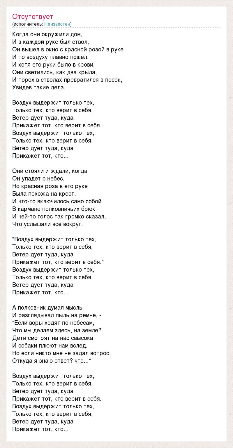 Когда они окружили дом, И в каждой руке был ствол, Он вышел в окно с красной розой в руке И по воздуху плавно пошел. И хотя его руки было в крови, Они светились, как два крыла, И порох в стволах превратился в песок, Увидев такие дела. Воздух выдержит только тех, Только тех, кто верит в себя, Ветер дует туда, куда Прикажет тот, кто верит в себя. Воздух выдержит только тех, Только тех, кто верит в себя, Ветер дует туда, куда Прикажет тот, кто... Они стояли и ждали, когда Он упадет с небес, Но красная роза в его руке Была похожа на крест. И что-то включилось само собой В кармане полковничьих брюк И чей-то голос так громко сказал, Что услышали все вокруг. "Воздух выдержит только тех, Только тех, кто верит в себя, Ветер дует туда, куда Прикажет тот, кто верит в себя." Воздух выдержит только тех, Только тех, кто верит в себя, Ветер дует туда, куда Прикажет тот, кто... А полковник думал мысль И разглядывал пыль на ремне, - "Если воры ходят по небесам, Что мы делаем здесь, на земле? Дети смотрят на нас свысока И собаки плюют нам вслед. Но если никто мне не задал вопрос, Откуда я знаю ответ? что..." Воздух выдержит только тех, Только тех, кто верит в себя, Ветер дует туда, куда Прикажет тот, кто верит в себя. Воздух выдержит только тех, Только тех, кто верит в себя, Ветер дует туда, куда Прикажет тот, кто...