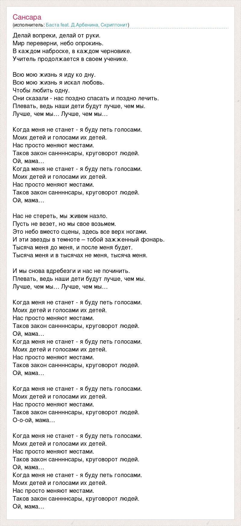Делай вопреки, делай от руки. Мир переверни, небо опрокинь. В каждом наброске, в каждом черновике. Учитель продолжается в своем ученике. Всю мою жизнь я иду ко дну. Всю мою жизнь я искал любовь. Чтобы любить одну. Они сказали - нас поздно спасать и поздно лечить. Плевать, ведь наши дети будут лучше, чем мы. Лучше, чем мы… Лучше, чем мы… Когда меня не станет - я буду петь голосами. Моих детей и голосами их детей. Нас просто меняют местами. Таков закон саннннсары, круговорот людей. Ой, мама… Когда меня не станет - я буду петь голосами. Моих детей и голосами их детей. Нас просто меняют местами. Таков закон саннннсары, круговорот людей. Ой, мама… Нас не стереть, мы живем назло. Пусть не везет, но мы свое возьмем. Это небо вместо сцены, здесь все верх ногами. И эти звезды в темноте – тобой зажженный фонарь. Тысяча меня до меня, и после меня будет. Тысяча меня и в тысячах не меня, тысяча меня. И мы снова вдребезги и нас не починить. Плевать, ведь наши дети будут лучше, чем мы. Лучше, чем мы… Лучше, чем мы… Когда меня не станет - я буду петь голосами. Моих детей и голосами их детей. Нас просто меняют местами. Таков закон саннннсары, круговорот людей. Ой, мама… Когда меня не станет - я буду петь голосами. Моих детей и голосами их детей. Нас просто меняют местами. Таков закон саннннсары, круговорот людей. Ой, мама… Когда меня не станет - я буду петь голосами. Моих детей и голосами их детей. Нас просто меняют местами. Таков закон саннннсары, круговорот людей. О-о-ой, мама… Когда меня не станет - я буду петь голосами. Моих детей и голосами их детей. Нас просто меняют местами. Таков закон саннннсары, круговорот людей. Ой, мама… Когда меня не станет - я буду петь голосами. Моих детей и голосами их детей. Нас просто меняют местами. Таков закон саннннсары, круговорот людей. Ой, мама…