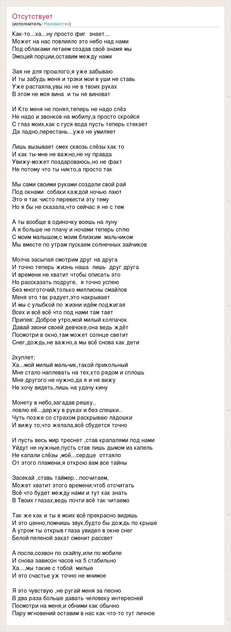 Как-то...ха...ну просто фиг знает... Может на нас повлияло это небо над нами Под облаками летаем создав своё знамя мы Эмоций порции,оставим между нами Зая не для прошлого,я уже забываю И ты забудь меня и трэки мои в уши не ставь Уже растаяла,увы но не в твоих руках В этом не моя вина и ты не виноват И Кто меня не понял,теперь не надо слёз Не надо и звонков на мобилу,а просто скройся С глаз моих,как с гуся вода пусть теперь стекает Да ладно,перестань...уже не умиляет Лишь вызывает смех сквозь слёзы как то И как ты-мне не важно,не ну правда Увижу-может поздароваюсь,но не факт Не потому что ты никто,а просто так Мы сами своими руками создали свой рай Под окнами собаки каждой ночью лают Это я так чисто перевести эту тему Но я бы не сказала,что сейчас я не с тем А ты вообще в одиночку воешь на луну А я больше не плачу и ночами теперь сплю С моим малышом,с моим близким мальчиком Мы вместе по утрам пускаем солнечных зайчиков Молча засыпая смотрим друг на друга И точно теперь жизнь наша лишь друг друга И времени не хватит чтобы описать это Но рассказать подруге, я точно успею Без многоточий,только миллионы смайлов Меня это так радует,это накрывает И мы с улыбкой по жизни идём поджигая Всех и всё всё что под нами там тает Припев: Доброе утро,мой милый колпачок Давай звони своей девчоке,она ведь ждёт Посмотри в окно,там может солнце светит Снег,дождь,не важно,а мы всё снова как дети 2куплет: Ха...мой милый мальчик,такой прикольный Мне стало наплевать на тех,кто рядом и сплошь Мне другого не нужно,да я и не вижу Не хочу видеть,лишь на удачу кину Монету в небо,загадав решку.. ловлю её...держу в руках и без спешки.. Чуть позже со страхом раскрываю ладошки И вижу то,что желала,всё сбудется точно И пусть весь мир треснет ,став крапалями под нами Уйдут не нужные,пусть став лишь дымом из капель Не капали слёзы ,моё...сердце оттаяло От этого пламени,я открою вам все тайны Засекай ,ставь таймер...посчитаем, Может хватит этого времени,чтоб отсчитать Всё что будет между нами и тут как знать В Твоих глазах,ведь почти всё так читаемо Так же как и ты в моих всё прекрасно видишь И это ценно,помнишь звук,будто бы дождь по крыше А утром ты открыв глаза увидел в окне снег Белой пеленой закат сменит рассвет А после,созвон по скайпу,или по мобиле И снова зависон часов на 5 стабильно Ха...,мы такие с тобой милые И это счастье уж точно не мнимое Я это чувствую ,не ругай меня за песню В два раза больше давать человеку интересней Посмотри на меня,и обними как обычно Пару мгновений оставим в нас как что-то тут личное