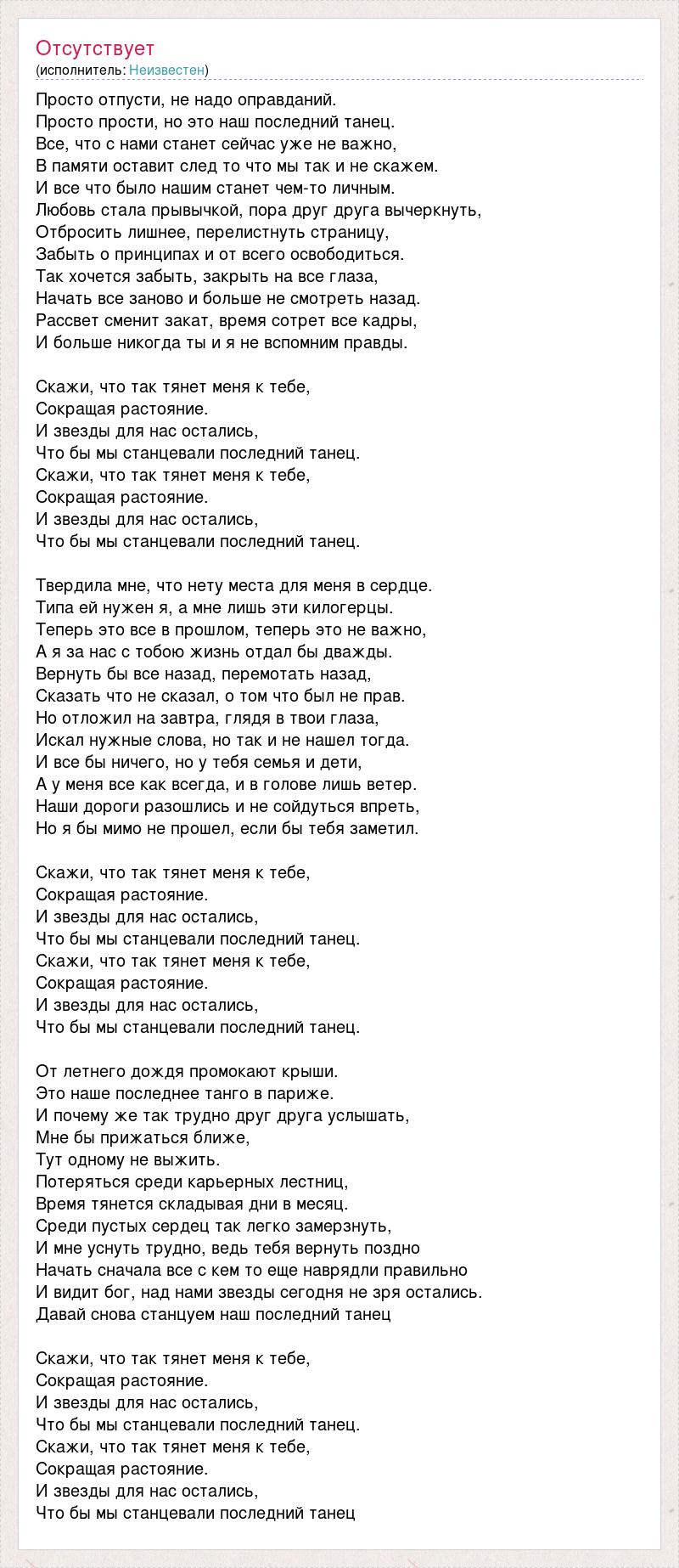 Просто отпусти, не надо оправданий. Просто прости, но это наш последний танец. Все, что с нами станет сейчас уже не важно, В памяти оставит след то что мы так и не скажем. И все что было нашим станет чем-то личным. Любовь стала прывычкой, пора друг друга вычеркнуть, Отбросить лишнее, перелистнуть страницу, Забыть о принципах и от всего освободиться. Так хочется забыть, закрыть на все глаза, Начать все заново и больше не смотреть назад. Рассвет сменит закат, время сотрет все кадры, И больше никогда ты и я не вспомним правды. Скажи, что так тянет меня к тебе, Сокращая растояние. И звезды для нас остались, Что бы мы станцевали последний танец. Скажи, что так тянет меня к тебе, Сокращая растояние. И звезды для нас остались, Что бы мы станцевали последний танец. Твердила мне, что нету места для меня в сердце. Типа ей нужен я, а мне лишь эти килогерцы. Теперь это все в прошлом, теперь это не важно, А я за нас с тобою жизнь отдал бы дважды. Вернуть бы все назад, перемотать назад, Сказать что не сказал, о том что был не прав. Но отложил на завтра, глядя в твои глаза, Искал нужные слова, но так и не нашел тогда. И все бы ничего, но у тебя семья и дети, А у меня все как всегда, и в голове лишь ветер. Наши дороги разошлись и не сойдуться впреть, Но я бы мимо не прошел, если бы тебя заметил. Скажи, что так тянет меня к тебе, Сокращая растояние. И звезды для нас остались, Что бы мы станцевали последний танец. Скажи, что так тянет меня к тебе, Сокращая растояние. И звезды для нас остались, Что бы мы станцевали последний танец. От летнего дождя промокают крыши. Это наше последнее танго в париже. И почему же так трудно друг друга услышать, Мне бы прижаться ближе, Тут одному не выжить. Потеряться среди карьерных лестниц, Время тянется складывая дни в месяц. Среди пустых сердец так легко замерзнуть, И мне уснуть трудно, ведь тебя вернуть поздно Начать сначала все с кем то еще наврядли правильно И видит бог, над нами звезды сегодня не зря остались. Давай снова станцуем наш последний танец Скажи, что так тянет меня к тебе, Сокращая растояние. И звезды для нас остались, Что бы мы станцевали последний танец. Скажи, что так тянет меня к тебе, Сокращая растояние. И звезды для нас остались, Что бы мы станцевали последний танец