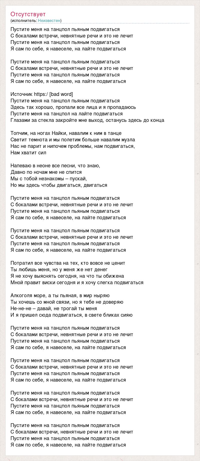 Пустите меня на танцпол пьяным подвигаться С бокалами встречи, невнятные речи и это не лечит Пустите меня на танцпол пьяным подвигаться Я сам по себе, я навеселе, на лайте подвигаться Пустите меня на танцпол пьяным подвигаться С бокалами встречи, невнятные речи и это не лечит Пустите меня на танцпол пьяным подвигаться Я сам по себе, я навеселе, на лайте подвигаться Источник https:/ [bad word] Пустите меня на танцпол пьяным подвигаться Здесь так хорошо, пропали все лица и я пропадаюсь Пустите меня на танцпол на лайте подвигаться Глазами за стекла закройте мне выход, останусь здесь до конца Топчим, на ногах Найки, навалим к ним в танце Светит темнота и мы полетим больше навалим музла Нас не парит и нипочем проблемы, нам подвигаться, Нам хватит сил Напеваю в неоне все песни, что знаю, Давно по ночам мне не спится Мы с тобой незнакомы – пускай, Но мы здесь чтобы двигаться, двигаться Пустите меня на танцпол пьяным подвигаться С бокалами встречи, невнятные речи и это не лечит Пустите меня на танцпол пьяным подвигаться Я сам по себе, я навеселе, на лайте подвигаться Пустите меня на танцпол пьяным подвигаться С бокалами встречи, невнятные речи и это не лечит Пустите меня на танцпол пьяным подвигаться Я сам по себе, я навеселе, на лайте подвигаться Потратил все чувства на тех, кто вовсе не ценит Ты любишь меня, но у меня же нет денег Я не хочу выяснять сегодня, на что ты обижена Мной правит виски сегодня и я хочу слегка подвигаться Алкоголя море, а ты пьяная, в мир ныряю Ты хочешь со мной связи, но я тебе не доверяю Не-не-не – давай, не трогай ты меня И я пришел сюда подвигаться, в свете бликах сияю Пустите меня на танцпол пьяным подвигаться С бокалами встречи, невнятные речи и это не лечит Пустите меня на танцпол пьяным подвигаться Я сам по себе, я навеселе, на лайте подвигаться Пустите меня на танцпол пьяным подвигаться С бокалами встречи, невнятные речи и это не лечит Пустите меня на танцпол пьяным подвигаться Я сам по себе, я навеселе, на лайте подвигаться Пустите меня на танцпол пьяным подвигаться С бокалами встречи, невнятные речи и это не лечит Пустите меня на танцпол пьяным подвигаться Я сам по себе, я навеселе, на лайте подвигаться Пустите меня на танцпол пьяным подвигаться С бокалами встречи, невнятные речи и это не лечит Пустите меня на танцпол пьяным подвигаться Я сам по себе, я навеселе, на лайте подвигаться