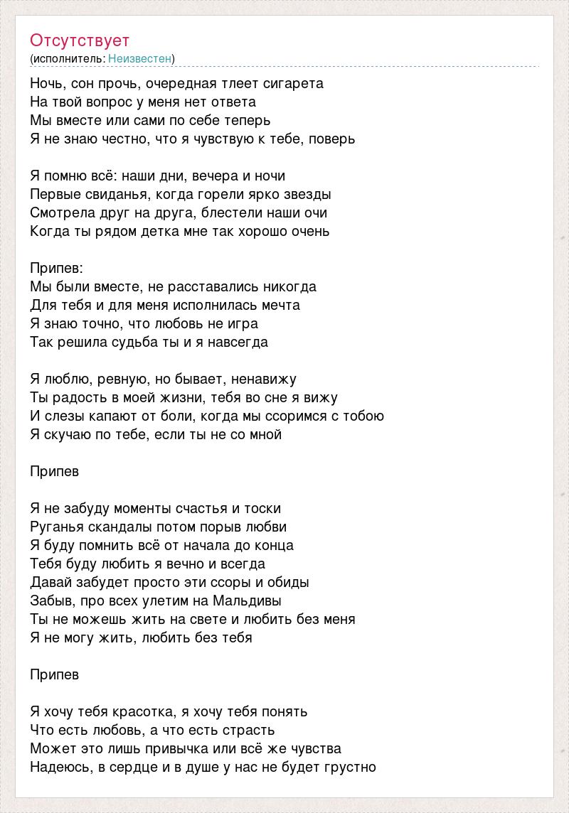 Ночь, сон прочь, очередная тлеет сигарета На твой вопрос у меня нет ответа Мы вместе или сами по себе теперь Я не знаю честно, что я чувствую к тебе, поверь Я помню всё: наши дни, вечера и ночи Первые свиданья, когда горели ярко звезды Смотрела друг на друга, блестели наши очи Когда ты рядом детка мне так хорошо очень Припев: Мы были вместе, не расставались никогда Для тебя и для меня исполнилась мечта Я знаю точно, что любовь не игра Так решила судьба ты и я навсегда Я люблю, ревную, но бывает, ненавижу Ты радость в моей жизни, тебя во сне я вижу И слезы капают от боли, когда мы ссоримся с тобою Я скучаю по тебе, если ты не со мной Припев Я не забуду моменты счастья и тоски Руганья скандалы потом порыв любви Я буду помнить всё от начала до конца Тебя буду любить я вечно и всегда Давай забудет просто эти ссоры и обиды Забыв, про всех улетим на Мальдивы Ты не можешь жить на свете и любить без меня Я не могу жить, любить без тебя Припев Я хочу тебя красотка, я хочу тебя понять Что есть любовь, а что есть страсть Может это лишь привычка или всё же чувства Надеюсь, в сердце и в душе у нас не будет грустно