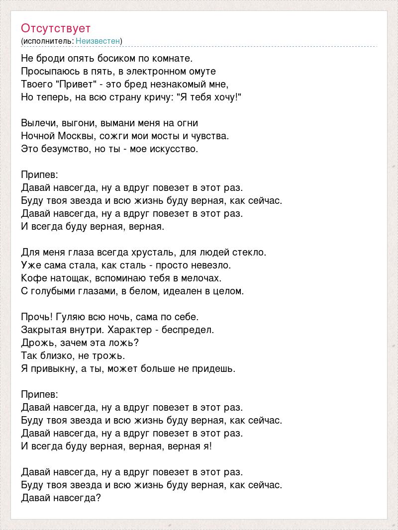 Не броди опять босиком по комнате. Просыпаюсь в пять, в электронном омуте Твоего "Привет" - это бред незнакомый мне, Но теперь, на всю страну кричу: "Я тебя хочу!" Вылечи, выгони, вымани меня на огни Ночной Москвы, сожги мои мосты и чувства. Это безумство, но ты - мое искусство. Припев: Давай навсегда, ну а вдруг повезет в этот раз. Буду твоя звезда и всю жизнь буду верная, как сейчас. Давай навсегда, ну а вдруг повезет в этот раз. И всегда буду верная, верная. Для меня глаза всегда хрусталь, для людей стекло. Уже сама стала, как сталь - просто невезло. Кофе натощак, вспоминаю тебя в мелочах. С голубыми глазами, в белом, идеален в целом. Прочь! Гуляю всю ночь, сама по себе. Закрытая внутри. Характер - беспредел. Дрожь, зачем эта ложь? Так близко, не трожь. Я привыкну, а ты, может больше не придешь. Припев: Давай навсегда, ну а вдруг повезет в этот раз. Буду твоя звезда и всю жизнь буду верная, как сейчас. Давай навсегда, ну а вдруг повезет в этот раз. И всегда буду верная, верная, верная я! Давай навсегда, ну а вдруг повезет в этот раз. Буду твоя звезда и всю жизнь буду верная, как сейчас. Давай навсегда?