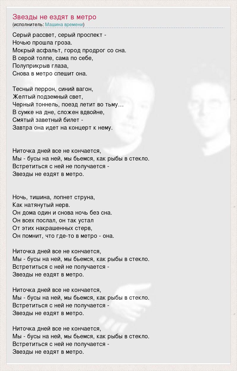 Серый рассвет, серый проспект - Ночью прошла гроза. Мокрый асфальт, город продрог со сна. В серой толпе, сама по себе, Полуприкрыв глаза, Снова в метро спешит она. Тесный перрон, синий вагон, Желтый подземный свет, Черный тоннель, поезд летит во тьму… В сумке на дне, сложен вдвойне, Смятый заветный билет - Завтра она идет на концерт к нему. Ниточка дней все не кончается, Мы - бусы на ней, мы бьемся, как рыбы в стекло. Встретиться с ней не получается - Звезды не ездят в метро. Ночь, тишина, лопнет струна, Как натянутый нерв. Он дома один и снова ночь без сна. Он всех послал, он так устал От этих накрашенных стерв, Он помнит, что где-то в метро - она. Ниточка дней все не кончается, Мы - бусы на ней, мы бьемся, как рыбы в стекло. Встретиться с ней не получается - Звезды не ездят в метро. Ниточка дней все не кончается, Мы - бусы на ней, мы бьемся, как рыбы в стекло. Встретиться с ней не получается - Звезды не ездят в метро. Ниточка дней все не кончается, Мы - бусы на ней, мы бьемся, как рыбы в стекло. Встретиться с ней не получается - Звезды не ездят в метро.
