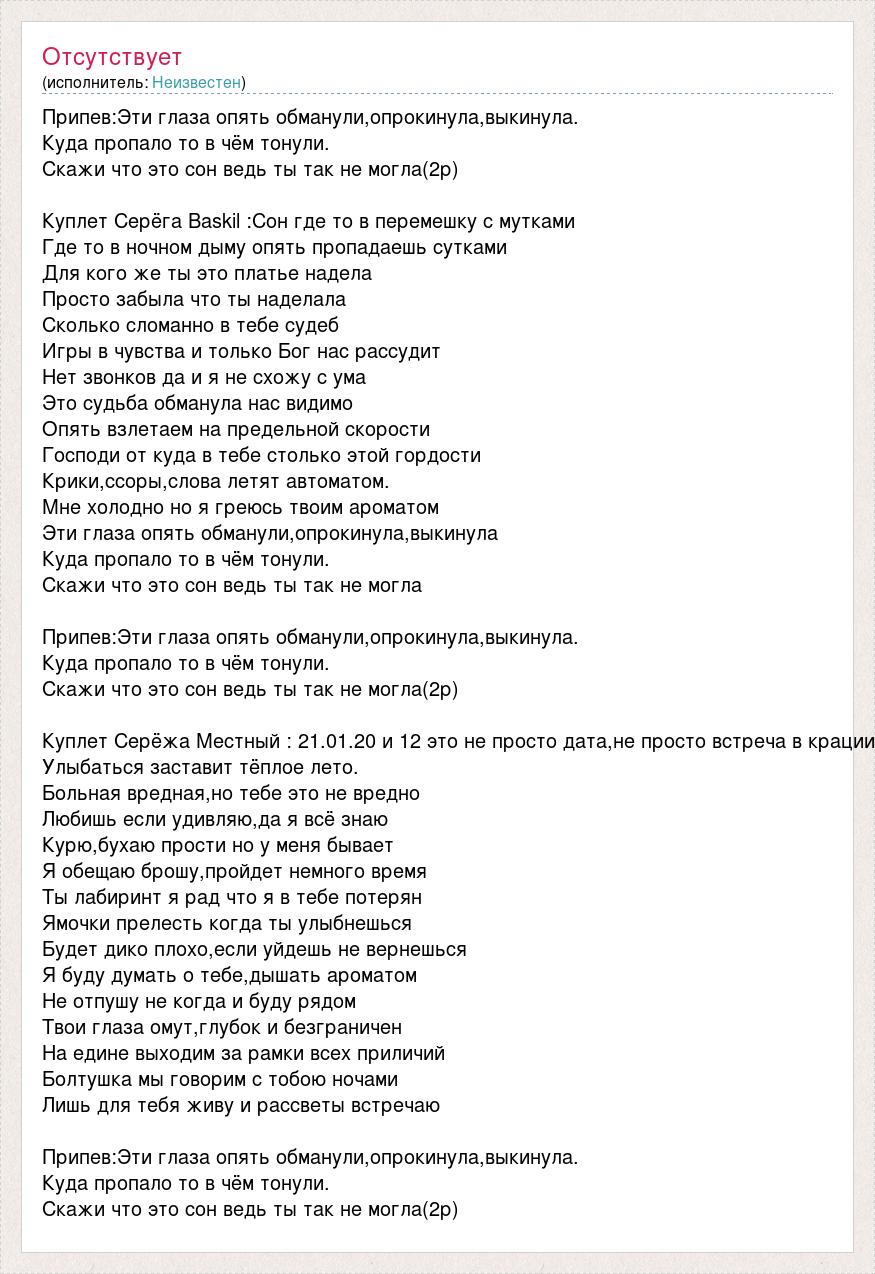 Припев:Эти глаза опять обманули,опрокинула,выкинула. Куда пропало то в чём тонули. Скажи что это сон ведь ты так не могла(2р) Куплет Серёга Baskil :Сон где то в перемешку с мутками Где то в ночном дыму опять пропадаешь сутками Для кого же ты это платье надела Просто забыла что ты наделала Сколько сломанно в тебе судеб Игры в чувства и только Бог нас рассудит Нет звонков да и я не схожу с ума Это судьба обманула нас видимо Опять взлетаем на предельной скорости Господи от куда в тебе столько этой гордости Крики,ссоры,слова летят автоматом. Мне холодно но я греюсь твоим ароматом Эти глаза опять обманули,опрокинула,выкинула Куда пропало то в чём тонули. Скажи что это сон ведь ты так не могла Припев:Эти глаза опять обманули,опрокинула,выкинула. Куда пропало то в чём тонули. Скажи что это сон ведь ты так не могла(2р) Куплет Серёжа Местный : 21.01.20 и 12 это не просто дата,не просто встреча в крации Улыбаться заставит тёплое лето. Больная вредная,но тебе это не вредно Любишь если удивляю,да я всё знаю Курю,бухаю прости но у меня бывает Я обещаю брошу,пройдет немного время Ты лабиринт я рад что я в тебе потерян Ямочки прелесть когда ты улыбнешься Будет дико плохо,если уйдешь не вернешься Я буду думать о тебе,дышать ароматом Не отпушу не когда и буду рядом Твои глаза омут,глубок и безграничен На едине выходим за рамки всех приличий Болтушка мы говорим с тобою ночами Лишь для тебя живу и рассветы встречаю Припев:Эти глаза опять обманули,опрокинула,выкинула. Куда пропало то в чём тонули. Скажи что это сон ведь ты так не могла(2р)