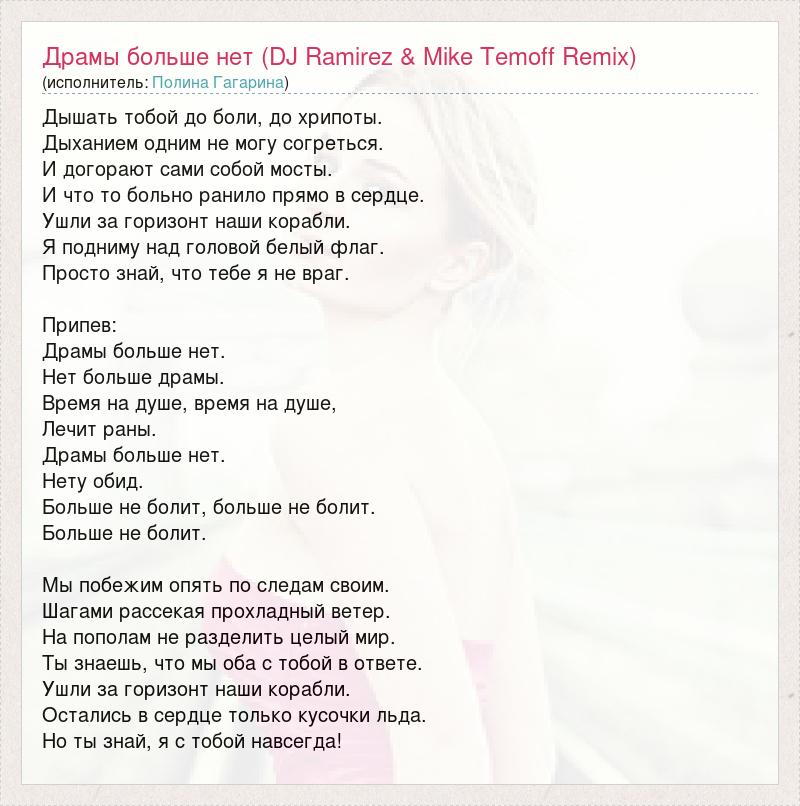 Дышать тобой до боли, до хрипоты. Дыханием одним не могу согреться. И догорают сами собой мосты. И что то больно ранило прямо в сердце. Ушли за горизонт наши корабли. Я подниму над головой белый флаг. Просто знай, что тебе я не враг. Припев: Драмы больше нет. Нет больше драмы. Время на душе, время на душе, Лечит раны. Драмы больше нет. Нету обид. Больше не болит, больше не болит. Больше не болит. Мы побежим опять по следам своим. Шагами рассекая прохладный ветер. На пополам не разделить целый мир. Ты знаешь, что мы оба с тобой в ответе. Ушли за горизонт наши корабли. Остались в сердце только кусочки льда. Но ты знай, я с тобой навсегда!